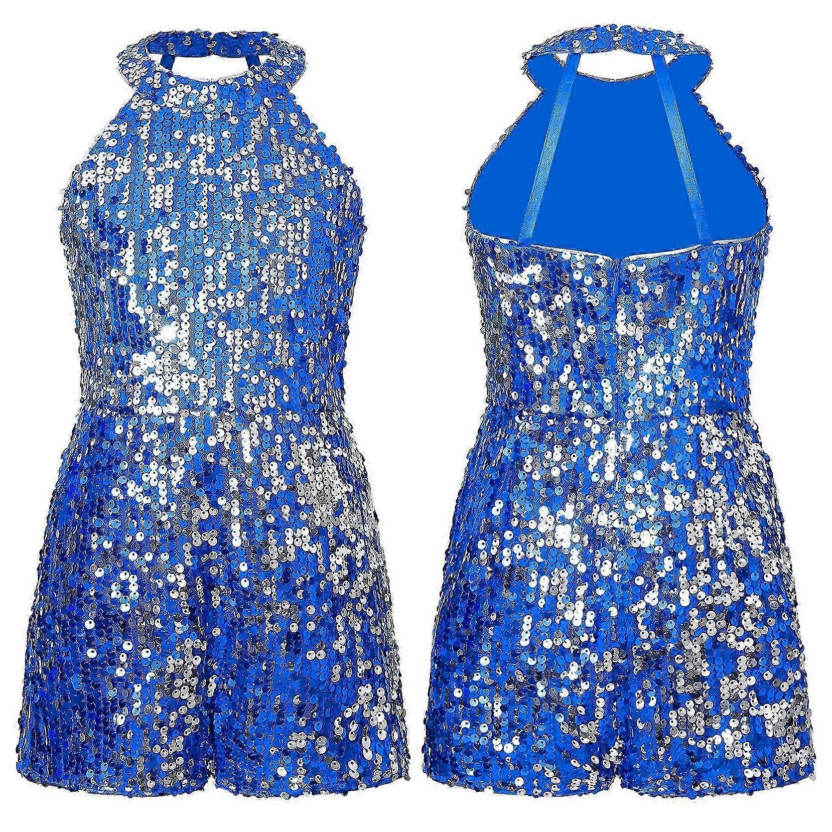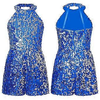 Girls Jazz Dance Costume Halter Shiny Sequins Leotard Sleeveless Short Jumpsuit Stage Performance Clothes