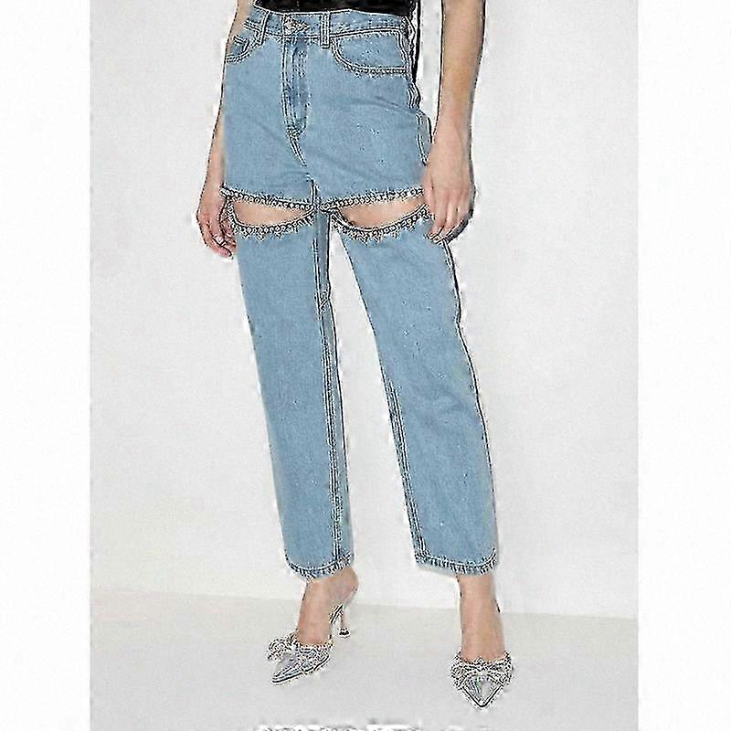 Mid-Waist Straight Leg Jeans with Beaded Embellishments and Thigh Cutout Design for Women
