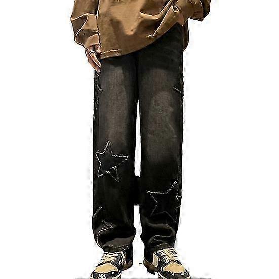 Men's Mid-Rise Zipper Fly Jeans with Oversize Star Aesthetic Pattern - Loose Fit Wide Leg Denim Trousers for High Street Style