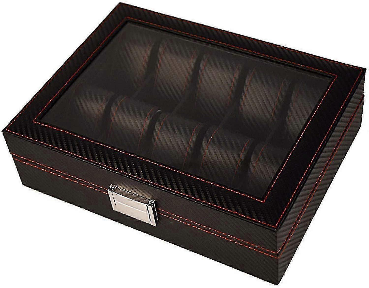 [Become a Watch Collector] When you own multiple watches, you are a collector.<br> Every watch collector needs a watch box.<br> This stylish 10-slot watch box will save your timepiece from the old fate of being left on the dressing table or thrown into the drawer.<br> [Carbon Fiber Leather Case] Leather almost always gives an elegant and unique impression.<br> Leather also has special protection and stability, which can provide a suitable frame for valuable watches.<br> The exquisite and precious leather is perfectly matched with the elegant and sophisticated ladies' watches.<br> [Bring you extra convenience] Click the lock to close or open the box with one hand; the transparent glass countertop allows you to have a glimpse of your collection and choose the most suitable day, night or upcoming occasion.<br> [High Quality] The watch jewelry display box is lined with high-quality artificial leather and removable pillows, which is not only durable but also soft.<br> The outer and inner edges of this case have fine stitching, which most effectively prevents dust, scratches or damage to the clock.<br> [Wide range of application] This watch storage box is very suitable for personal use (men, women, women) and watch shops to protect your watch from dust.<br> A great gift for any celebration or holiday, such as graduation, Christmas, birthday, promotion, holiday, retirement, etc.