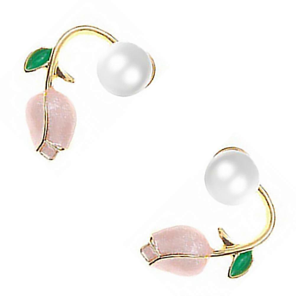 Tulip Design Pearl Ear Studs for Women Pink Color Elegant Flower Jewelry Small Size