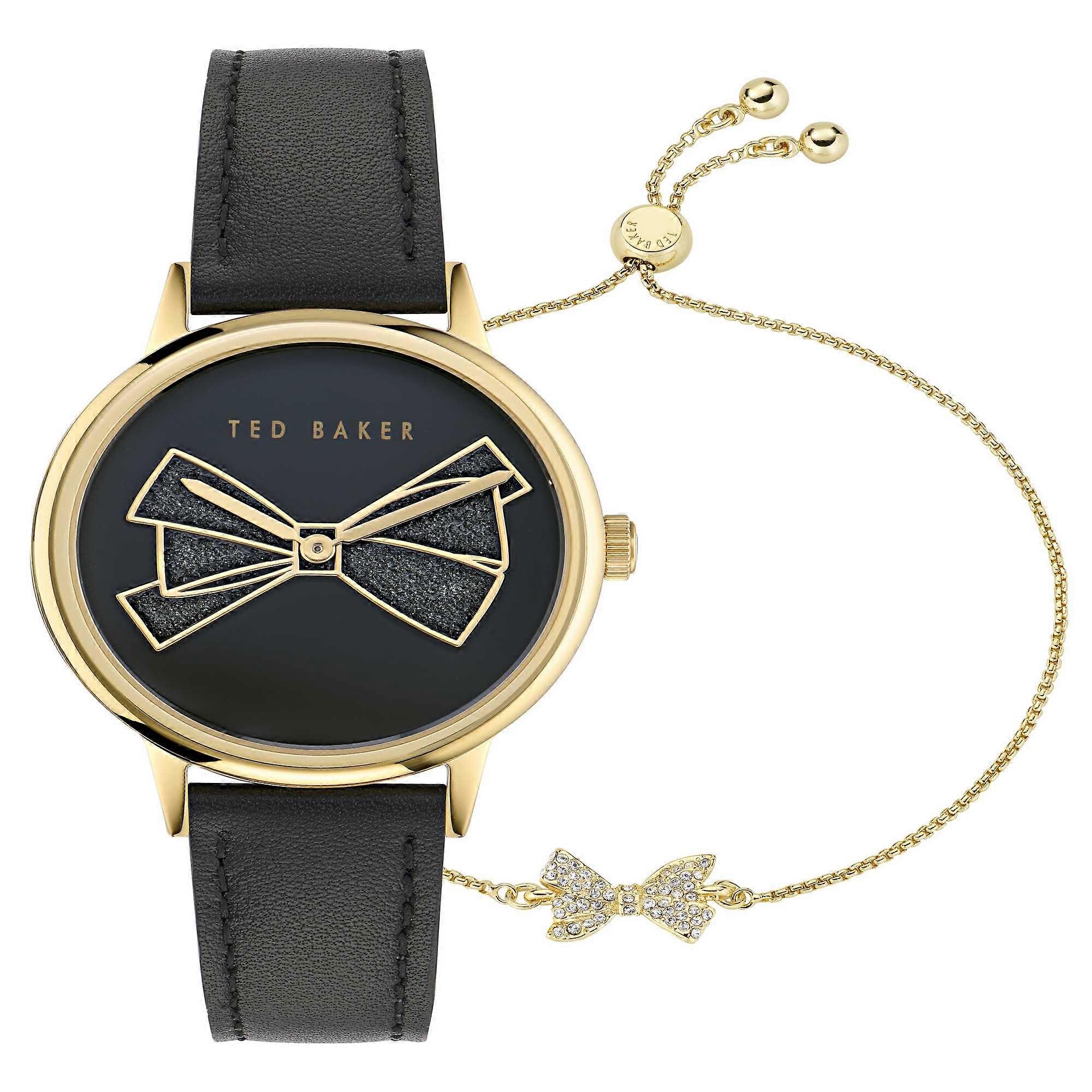 Ted Baker Ladies Iconic Black Leather Watch BKGFW2402 Luxury meets elegance in the Ladies Iconic Black Leather Watch BKGFW2402, a stunning timepiece designed to elevate your style. This watch, from the celebrated Phylipa family, showcases a captivating combination of a yellow gold RSST case and a sophisticated black dial adorned with diamond dust. Its lustrous look is accentuated by a delicately crafted 3D bow on the dial, making it not just a watch, but a statement piece. Collection - PHYLIPA ICONIC Gender - Ladies Case Material - Stainless Steel Case Colour - Gold-Tone Case Shape - Round Case Dimension - 36 mm Case Height - 8. Wear this exquisite watch with pride, knowing you are making an eco-friendly choice without sacrificing luxury. The watch boasts several outstanding features: Water Resistance: With a water resistance of up to 50 meters, the BKGFW2402 is designed to handle daily activities and unexpected splashes, allowing you to maintain your chic look regardless of circumstances. Crafted from Quality Materials: The case is made from durable stainless steel in a stunning gold-tone finish, ensuring both elegance and resilience. The black leather strap, complemented by a secure stainless steel buckle, promises comfort and style throughout your day. With a case diameter of 36 mm and a height of just 8.9 mm, this watch sits comfortably on your wrist. Its mineral glass lens is scratch-resistant, keeping it looking pristine even with everyday use. The watch mechanism features a precise quartz analog movement for accurate timekeeping and reliability. In addition, every purchase is packaged beautifully and shipped with a gift bag, box, and a certificate of authenticity from Ted Baker. Indulge in the luxury of the Ladies Iconic Black Leather Watch BKGFW2402 and experience timeless style fused with contemporary design. Redefine your watch collection with this iconic piece that speaks volumes of sophistication and class.