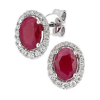Jewelco London 9ct White Gold Round 20pts Diamond Oval 1.9ct Ruby Cluster Drop Earrings