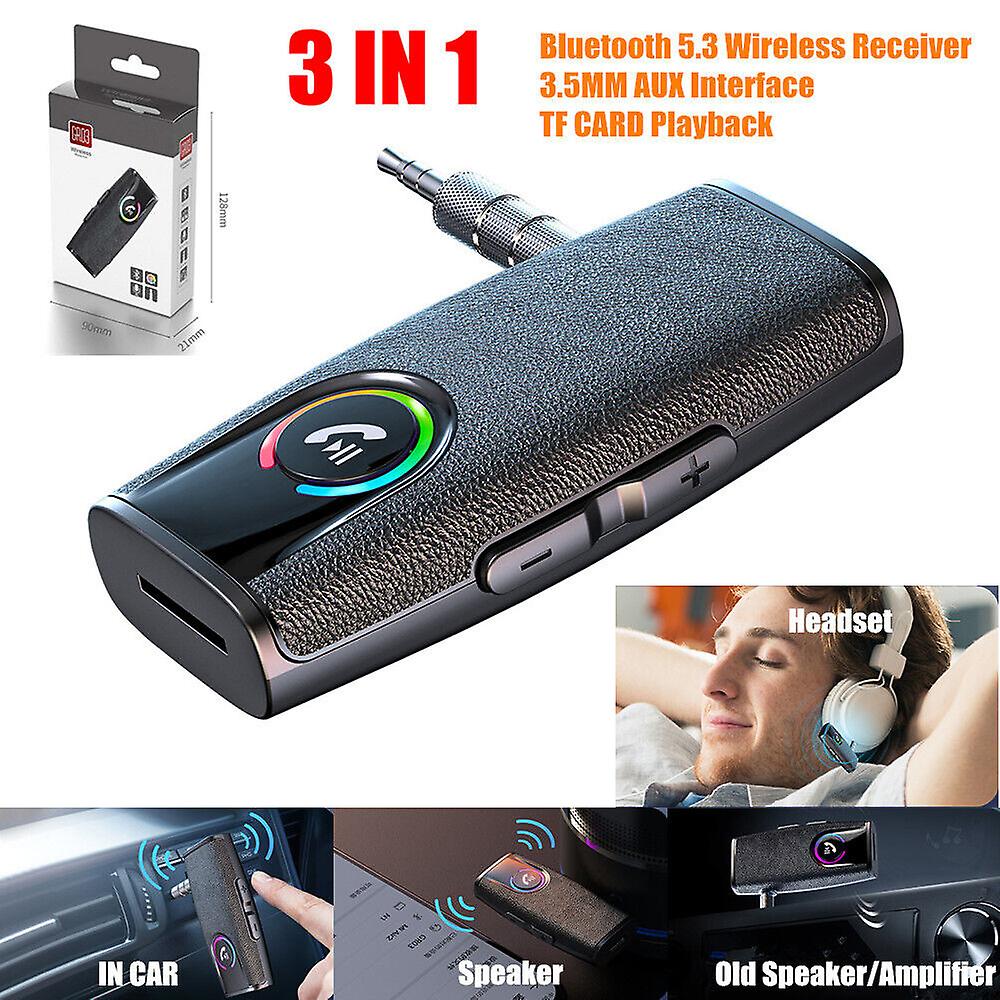 Handsfree Bluetooth 5.3 Audio Music Receiver Wireless 3.5mm AUX Home Car Adapter Description: This Bluetooth Receiver enables wireless listening to any Bluetooth enabled devices. It can be used with almost any audio receiver with an audio input jack, including automobiles. Listen to music from your smartphone or mp3 player on your existing home or car audio system. To enjoy car music, call solutions, the use of smart phones to make calls and listen to music through the car stereo. This product is embedded echo cancellation microphone. Using only one button, you can easily switch between music and phone call. Features: High-performance Bluetooth 5.3 chip, stable and no latency. 10 Meters long distance transmission.  Lossless sound quality playback,CD-level exprerience. Support WAV/FLAC/APE lossless format. Classic leather texture, show luxury, full of personality, delicate touch.  Colorful power display.Four-level power indicator, control the power status at any time.  Good assistant for safe navigation. Connect mobile phone to car audio, increase volume of voice broadcast. Easier navigation, safer driving.  Support connecting two devices at the same time. Computer/Mobile phone/Tablet connect at will, swtich at will. Built-in stereo headphone amplifier, louder and more mellow sound, give you a concert experience.  250mAh Large capacity battery can play for about 15 hours after a full charge.  More audio playback modes: 3.5mm AUX interface + TF card playback + Bluetooth 5.3 reception.  Widely compatible, plug and play. Compatible with audio equipment with 3.5mm aux input interface, such as in car use, speaker, power amplifier, headset, etc.  Specifications: Bluetooth version: 5.3 Bluetooth protocol: A2DP AVRCP HFP HSP Sensitivity: 103db +/- 3dB Impedance: 32Mw Tramsmit distance: about 10m Battery: 3.7V/250mAh Play Time: about 15 hours Output connection: 3.5MM interface Input connection: 3.5MM interface Compatibility: Android, IOS system mobile phone, and all Bluetooth capable audio equipment, audio equipment with audio input interface. Color: Black Product Weight: 16.5g Packing size: 28 X 59 X 15mm Package Includes: 1 X Bluetooth Receiver 1 X 3.5mm Metal Audio Connector. 1 X Charging Cable 1 X User Manual