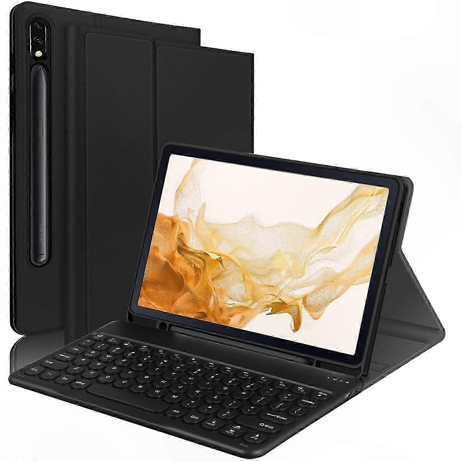 For Galaxy Tab S7 FE/S7+/S8+ Wireless Bluetooth Keyboard with PU Leather Tablet Case and Pen Slot - Black 2-in-1 tablet Bluetooth keyboard and protective case made of PU and TPU materials, suitable for travel and business use Bluetooth 3.0 keyboard provides stable connectivity and long-lasting performance Built-in 280mAh lithium battery offers extended usage time and convenient charging Convertible stand design allows hands-free viewing for movies and browsing Includes a dedicated slot to securely hold your stylus (stylus not included) Slim and lightweight construction for easy portability Compatible with Galaxy Tab S7 FE (Model SM-T730/T733/T736/T738), S7 Plus (Model SM-T730/T733/T736/T738), and S8+ (Model SM-T730/T733/T736/T738) Specifications: Battery type: Lithium polymer battery Bluetooth version: 3.0 (backward compatible with 4.0/5.0/5.1) Effective range: Up to 10 meters Standby time: Up to 100 days Continuous working time: Over 100 hours Charging time: 2-3 hours Battery capacity: 280mAh Battery lifespan: Up to 2 years Key switch life: 3 million keystrokes Modulation mode: GFSK Operating voltage: 3.0–4.2V Operating current: 4–8mA Standby current: Low power consumption
