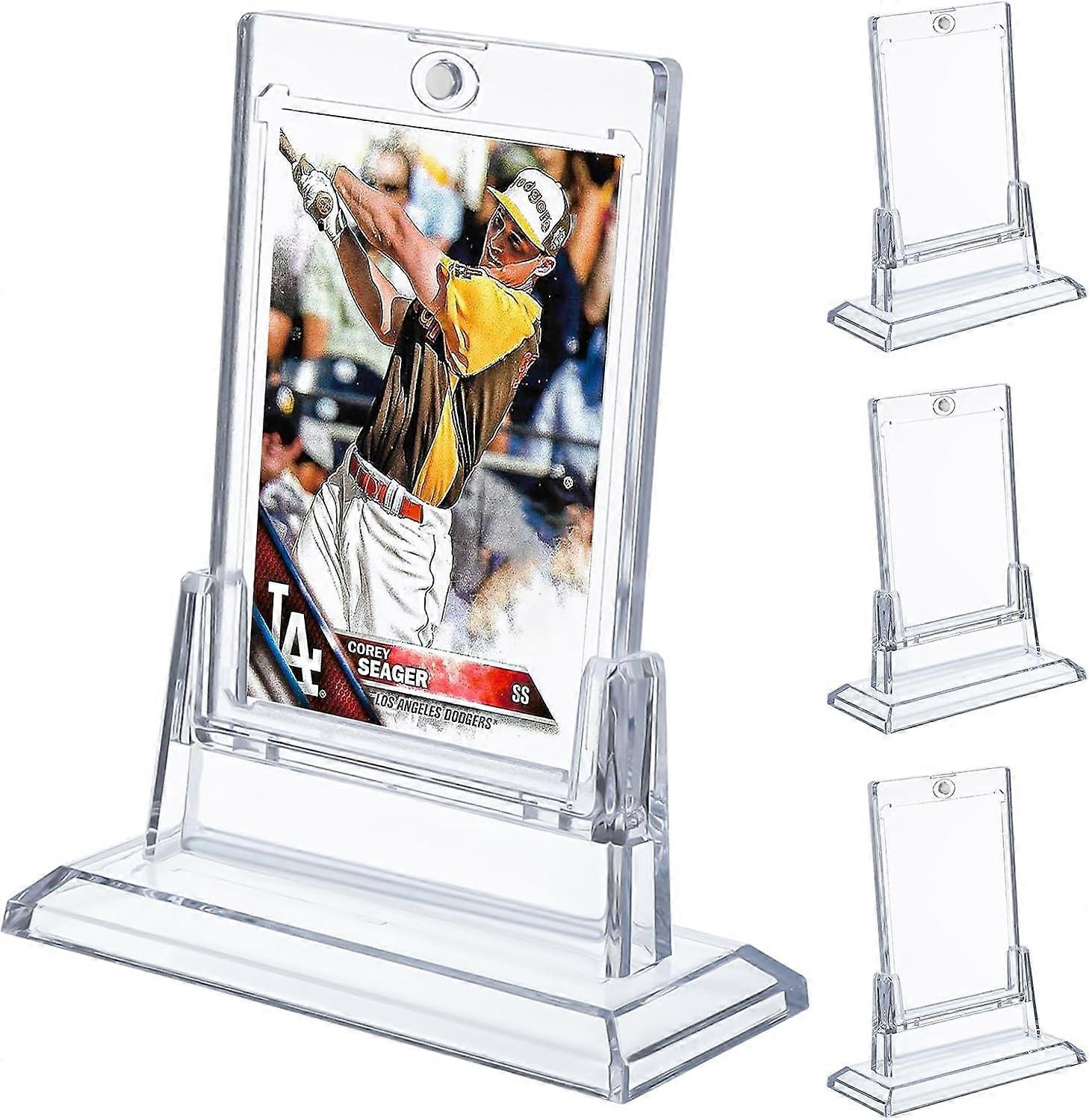 [What You Get]: This package includes 4 durable 35PT hard plastic trading card holders and 4 sleek acrylic card stands, perfect for securely storing and showcasing your valuable trading cards. Each card holder measures approximately 2.8 x 4.3 inches, designed specifically for standard-sized cards, while the acrylic stand measures about 4.4 x 1.8 x 2.1 inches. These holders are shatter-resistant, making them suitable for homes with playful pets. [Strong Magnetic Design]: Our innovative design ensures that the card holders remain securely closed, even when shaken, preventing any accidental spills of your cards. Accessing your cards is easy and convenient, allowing you to retrieve your treasured items without hassle. [Waterproof and Dustproof]: Constructed from high-quality materials, these hard card holders are both waterproof and dustproof. The unique diamond corner design keeps your cards securely in place and helps prevent fading, ensuring your collection stays in pristine condition. [Versatile Use]: Ideal for storing and displaying football, basketball, baseball, and hockey cards, these holders and stands enhance the décor of living rooms, game rooms, and study areas. They are perfect for collectors looking to showcase their favorite cards while keeping them organized. [Perfect Gift for Collectors]: This set makes an excellent gift for friends and family who enjoy card collecting, providing a reliable storage solution that protects their investments and showcases their passion.