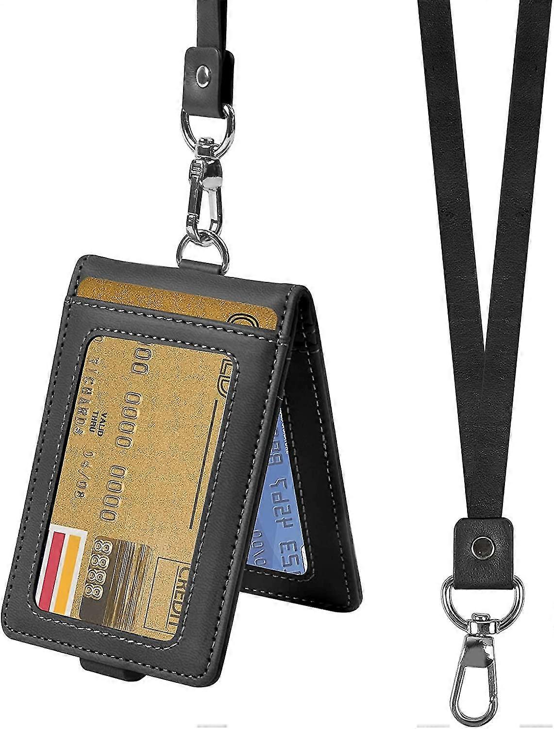 Black - Id Card Holder With Lanyard Vertical Leather Id Badge Holder Protector For Accessing Student Credit Cards, Holds Up To 5 Cards, 1 Piece
