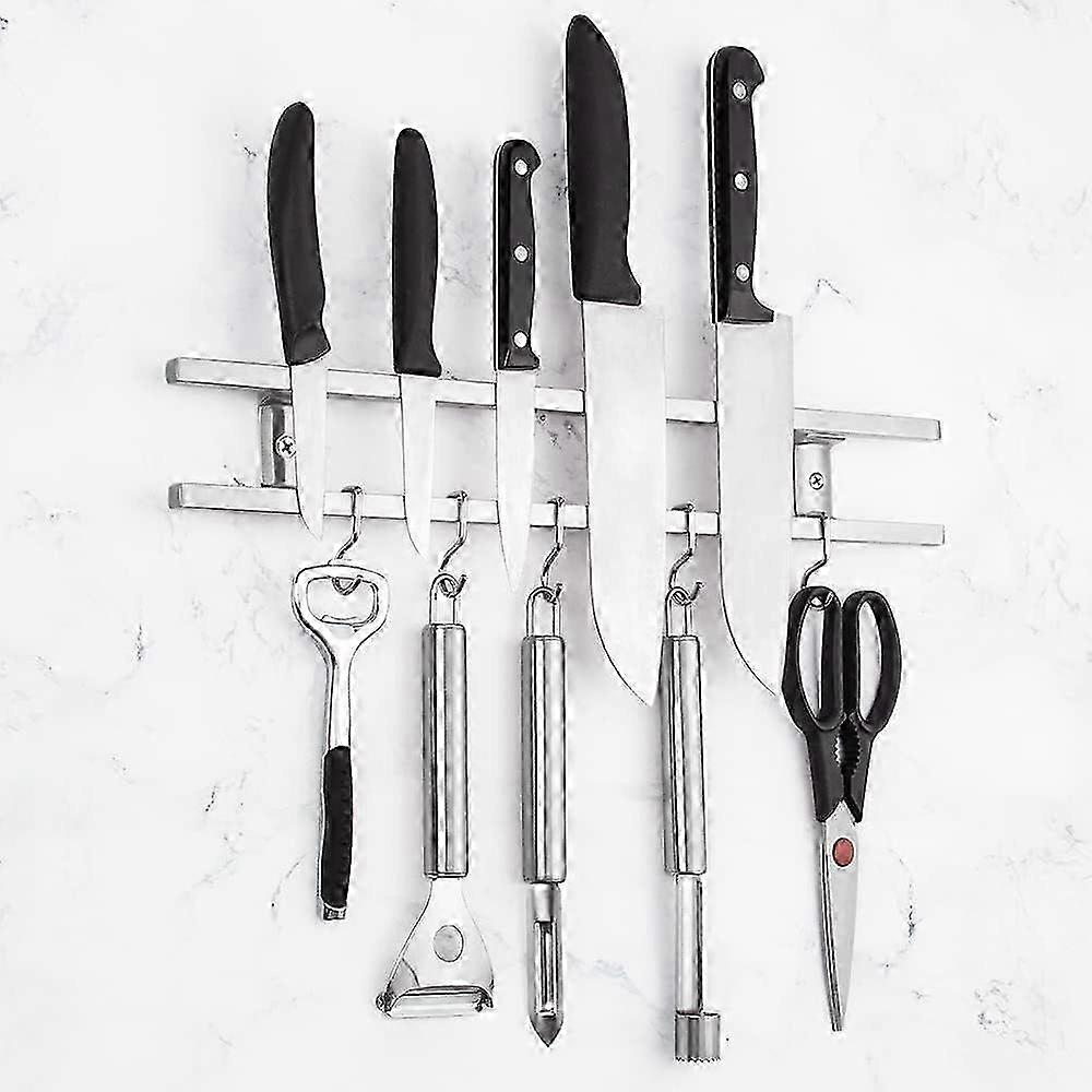 40CM Wall-Mounted Double Knife Holder with Stainless Steel Hooks and Magnetic Knife Holder