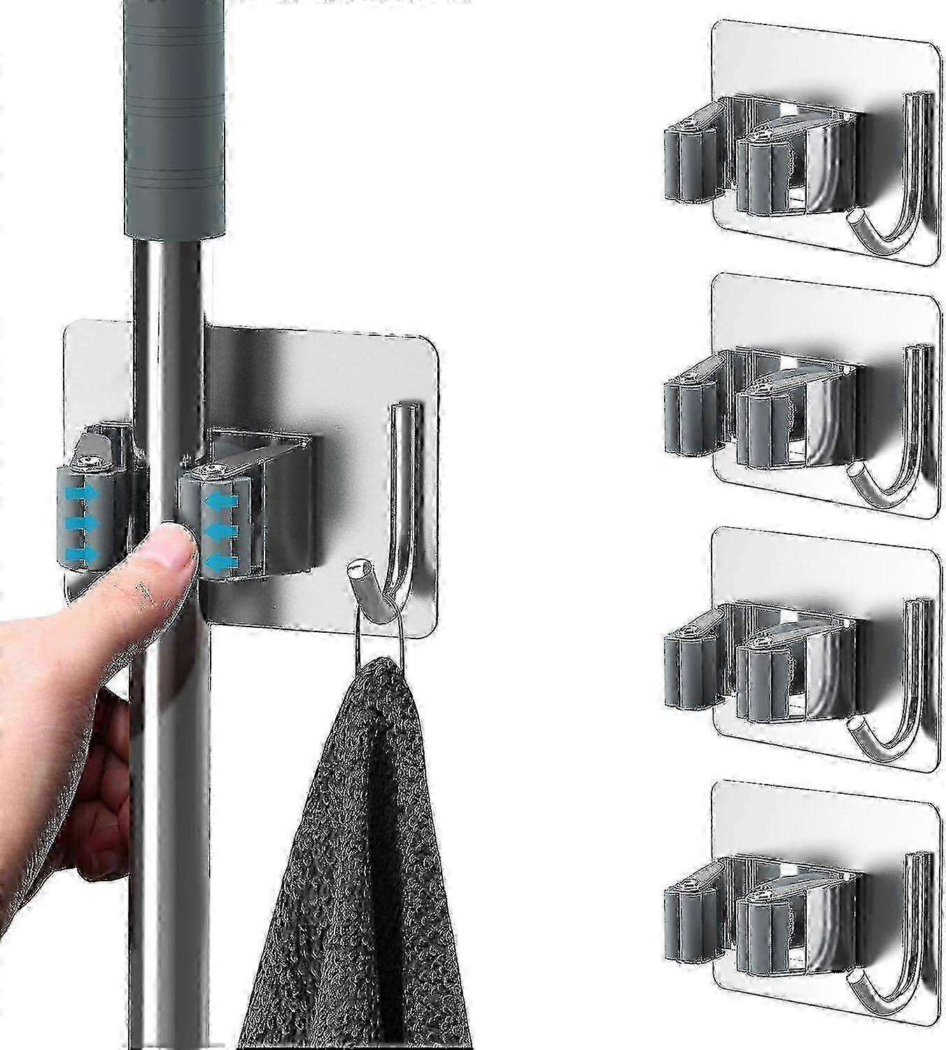 4pcs Broom Holder, No Drilling Wall Mounted Broom Holder, Adhesive Mop Holder with Hook for Kitchen Bathroom Garden Silver