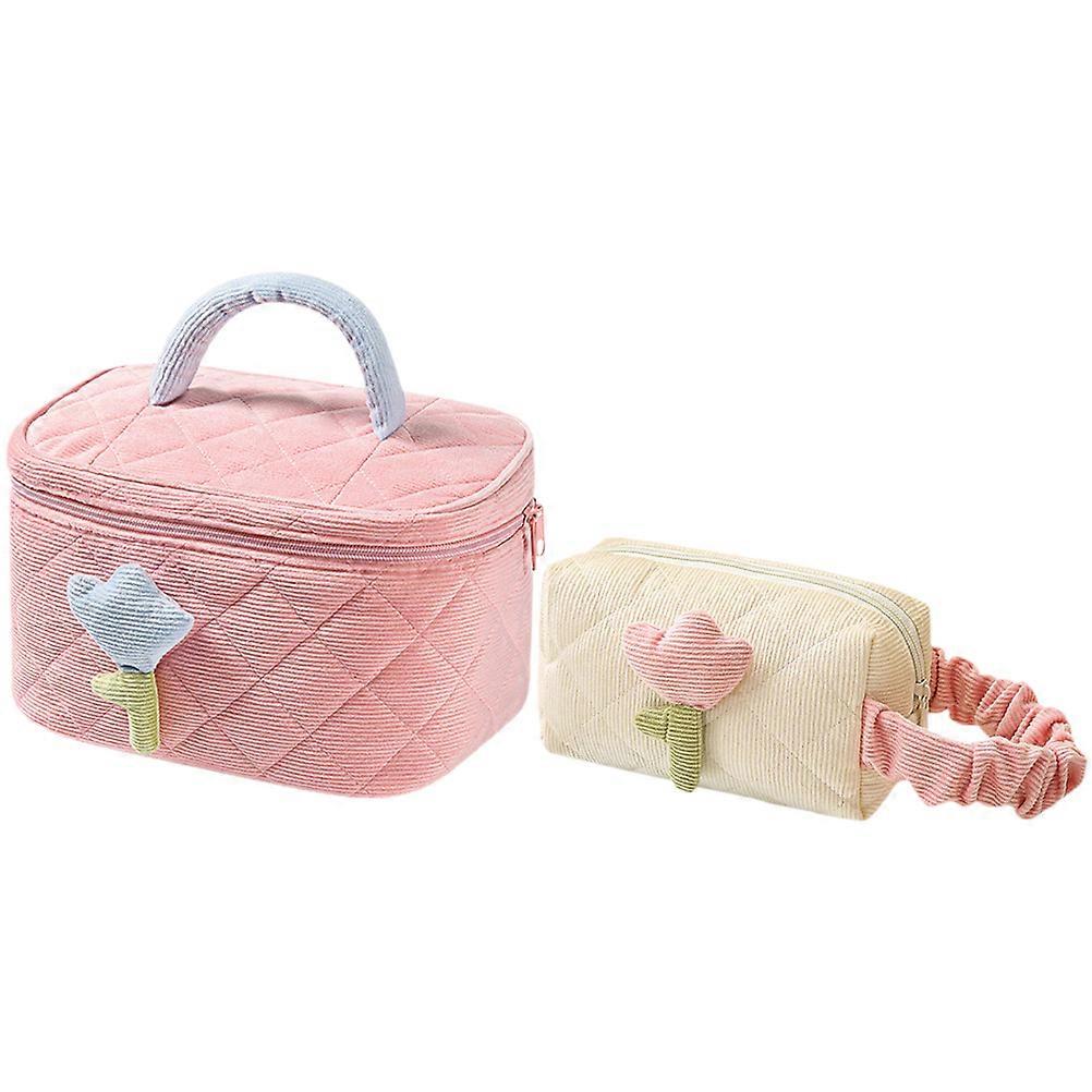 This compact cosmetics bag is more easy to carry around, convenient to take it to any place you like. Prevent from spills and leaks in suitcase, make your traveling more comfortable. Perfectly sized to store cosmetics, toiletry, lotions, jewelry, passport, snacks and other small items. Features -Color: Pink -Material: Corduroy -Size: 25.00X16.00X15.50cm/9.82X6.29X6.09in -Size: 30.00X12.50X8.50cm/11.79X4.91X3.34in - It can be placed directly in for traveling, keeps all your things well organized and saves more space. - Easy to carry makeup tools and toiletry supplies, also convenient for holding small items. - Work great for travel, vacation, business trip, gym, camping, bathroom and outdoor activity. - Zipper design prevents your things from losing. Provide you with convenience in your daily life. - Used to organize your toiletries, skin products, cosmetics, bath products, makeup accessories, jewelry, etc. Package list: 1 x Large Makeup Bag 1 x Small Makeup Bag