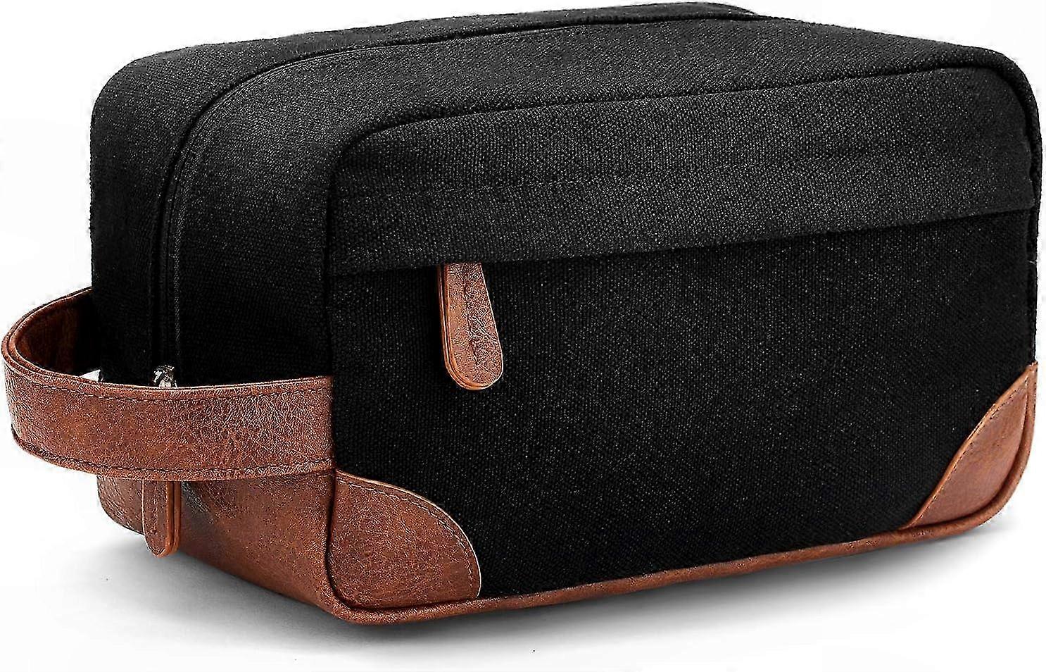 Large capacity and organized compartments: Size 10 x 5 x 5.5 inches. One main compartment provides ample space for facial cleanser, electric shaver, travel shampoo, and other toiletries. Features three small mesh pockets and one long zippered mesh pocket inside to keep small items organized and easy to find. Includes one front zipper pocket for additional storage convenience. Quality and water-resistant material: Made from durable and wear-resistant canvas material with no unpleasant odor. The combination of canvas and PU leather ensures a sturdy construction that maintains shape and offers protection against splashed water. Multipurpose use: Ideal for short trips or business travel, this bag offers sufficient space for bathroom essentials and allows for easy access during travel. Can also be used to store small items and makeup, serving as a practical storage pack or cosmetic organizer. Suitable for use in the bathroom or on a dressing table. Well-designed with multiple color options: The classic and stylish canvas toiletry bag is available in various colors. A great choice as a gift for men or friends, offering a pleasing appearance, practical size, and long-lasting quality that retains its look over time. Smooth SBS zipper and convenient handle: Leather handle allows for easy carrying and hanging. Reinforced bottom with leather enhances durability. The zipper pull design ensures smooth opening and closing. Compact size fits easily into suitcases for convenient packing.