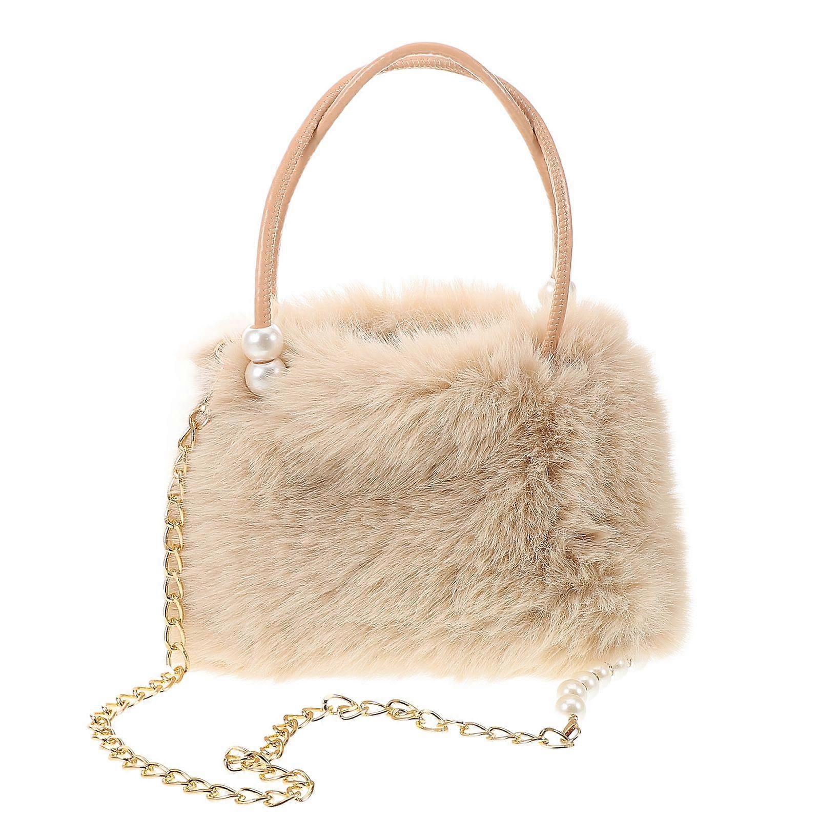 Large Capacity Faux Fur Tote Bag For Women With Pearl Chain Fuzzy Handbag Plush Shoulder Bag Elegant Evening Purse Beige