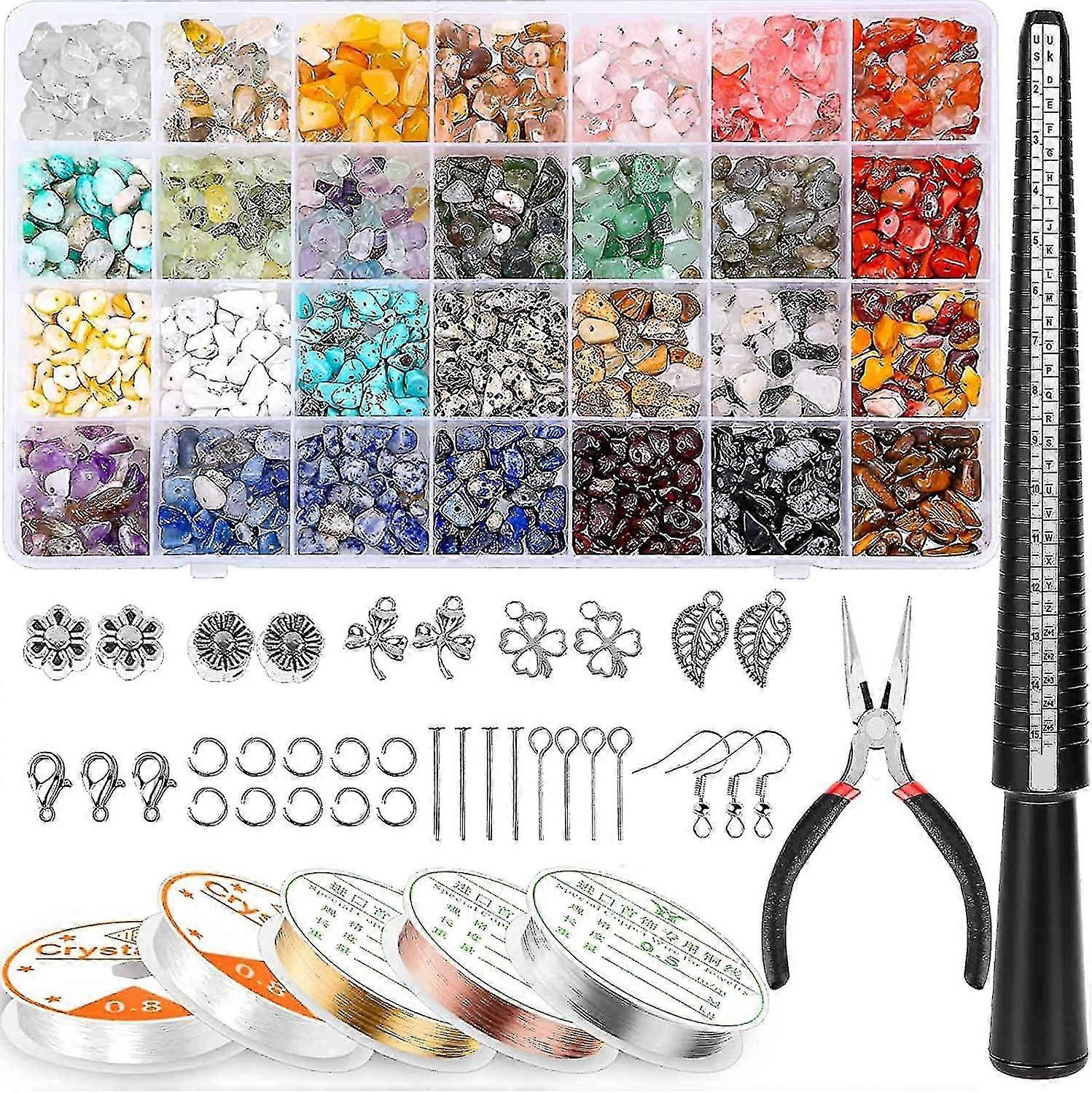 Features: 1660PCS GREAT VALUE SET:crystal stone beads for jewelry making kit contains 1400pcs chip beads, 3 rolls of jewelry wire, 2 rolls of elastic string, 50pcs different shaped pendants, 50pcs earring hooks, 100pcs head pins, 50pcs jump rings, 10pcs lobster clasp and jewelry pliers for jewelry ring crafts making 28 DIFFERENT COLORS CRYSTAL JEWELRY BEADS: There are 28 assorted color crystal stone beads of this crystal jewelry making kit. And beads for rings sizes ranging from 5mm to 8mm, they are irregular shapes, brilliant and gorgeous, great for any jewelry and ring making SUFFICIENT AMOUNT OF JEWELRY WIRE: These wire ring making kit provides 3 rolls of jewelry wire which include 3 colors: silver, gold, rose gold. Ideal matches for jewelry crafts, especially for jewelry ring making SILVER CHARMS FOR JEWELRY MAKING: This gemstone beads jewelry making kit also comes with 50pcs silver pendants and charms for jewelry making. And the elastic strings and tool pliers also included, great for beginners to DIY jewelry EARRING HOOKS WITH EARRING SUPLIES: Our crystal ring making kit comes with 50pcs silver earring hooks with the necessary supplies like jump rings, head pins. Great set for making your own personality style earring Package includes: 1set Crystal Jewellery Making Kit
