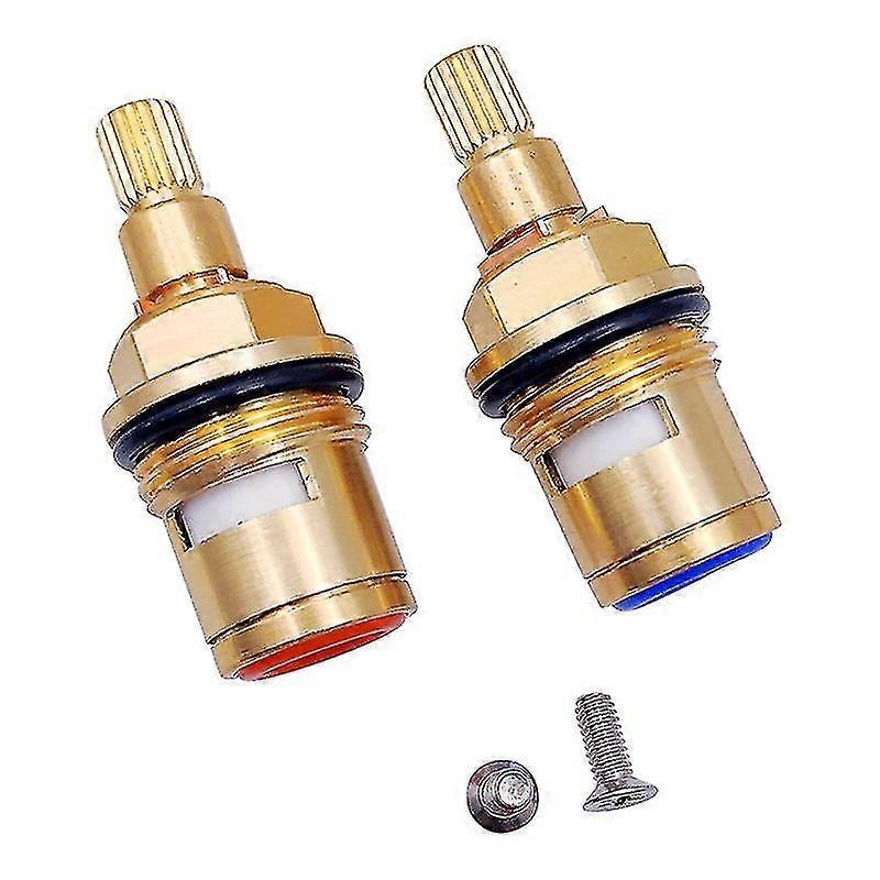 Replacement Brass Pair Ceramic Stem Disc Cartridge Mixer Hot And Cold Tap G1/2" For Bathroom Kitchen Tap(1 Pair Hot & Cold) Solid brass body and stem. Thread size G 1/2" BSP.Rubber O ring at the bottom, with threaded collar.Clockwise (Blue) and Anti-clockwise (Red) to turn the tap on.20 teeth on spline (top of stem) for handle, stem drilled with M4 threaded hole.Fit for taps of basin in bathroom, kitchen, etc. Suitable for both cold water and hot water. Solid brass body and stem.Specifications:Material: Brass, CeramicSpline Diameter: 7.6mmTeeth on Spline: 20 TeethThread size: G1/2 (1/2" 20.5mm)Threaded Collar: With Threaded CollarSize: 51mm x 18mm (Please view the picture for detail dimensions)Package Includes:1 x Replacement Tap Valves (Clockwise)1 x Replacement Tap Valves (Anti-clockwise)
