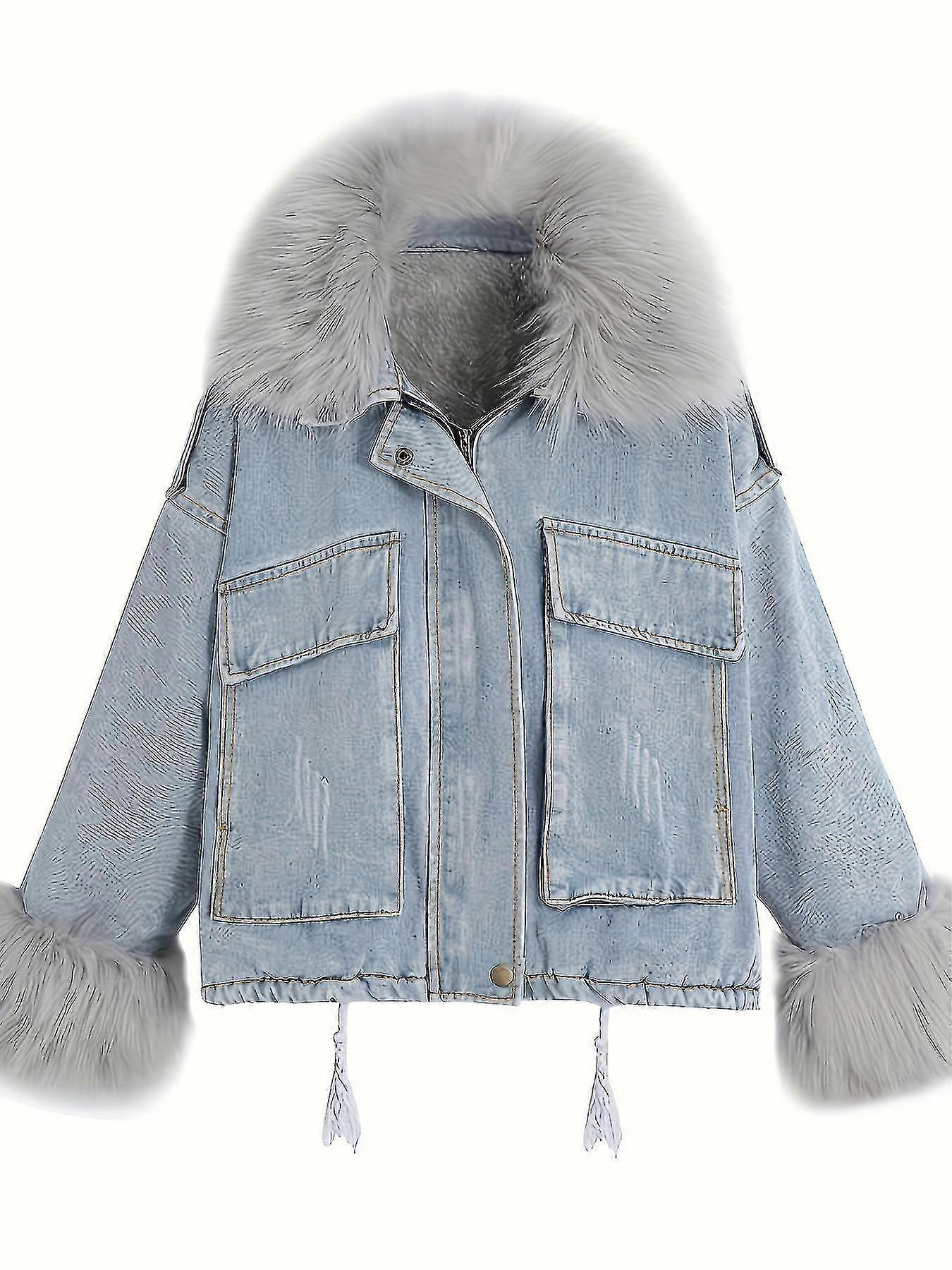 Fluffy Plush Collar & Cuffs Winter Warm Fur Fleece Coat Extra Large Square Pockets Drawstring Hem Denim Jacket Women's Denim Jackets