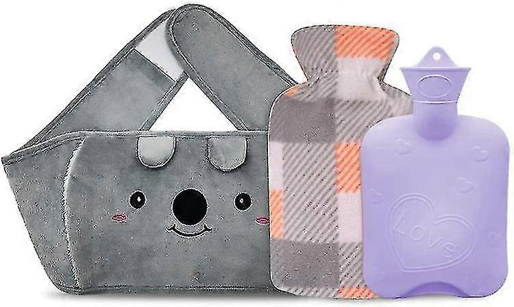 Hot Water Bottle With Cover, Quick Pain Relief Comfort For Neck, Back(plaid Cover + Gray Puppy Belt + Purple Water Bag)