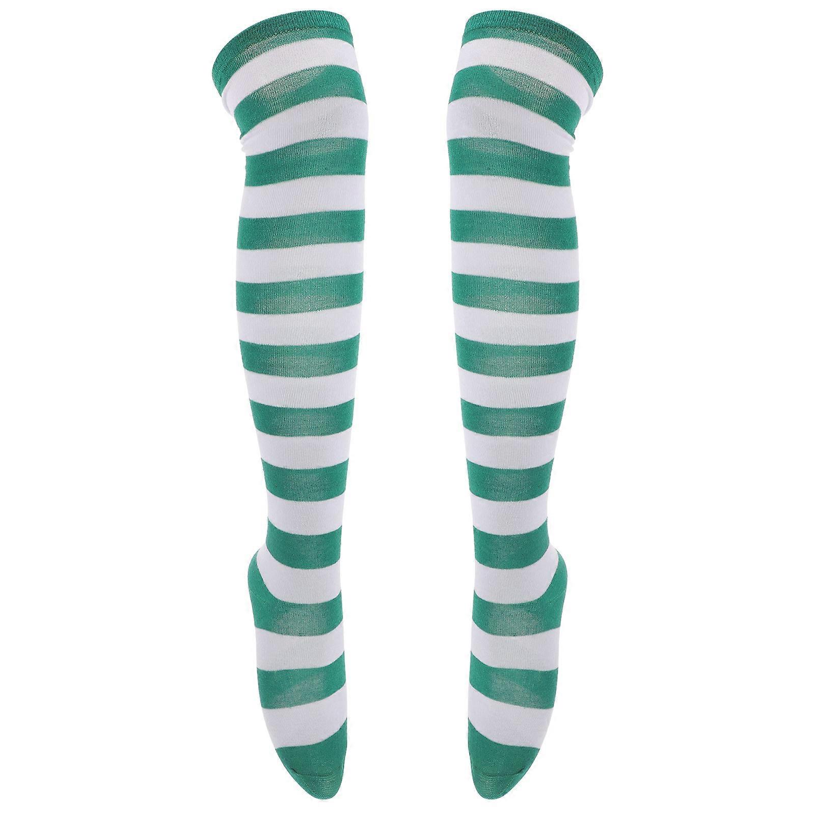 Pair of Women's Green and White Wide Striped Thigh High Over the Knee Stocking Socks (Green & White)