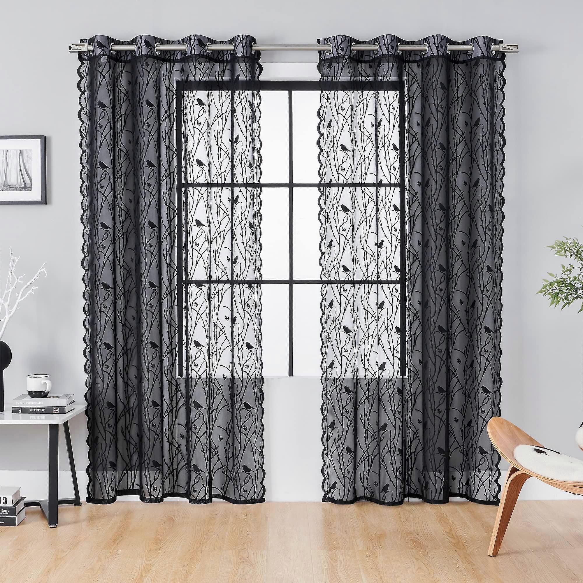 Black Sheer Curtains, 140200CM, Embroidered Bird On Tree Branch Grommet Sheer Drapes, Light Filtering Privacy Window Treatment Curtains