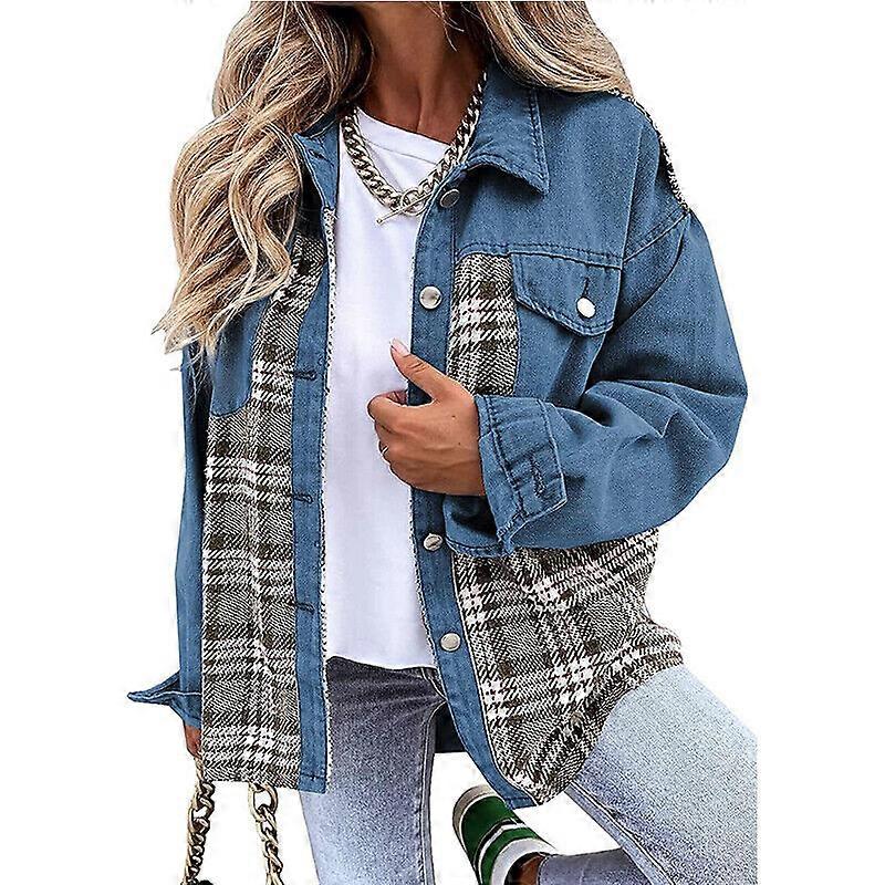 Women Denim Jacket Long Sleeve Plaid Button Down Coat Outwear Overcoat Colorful