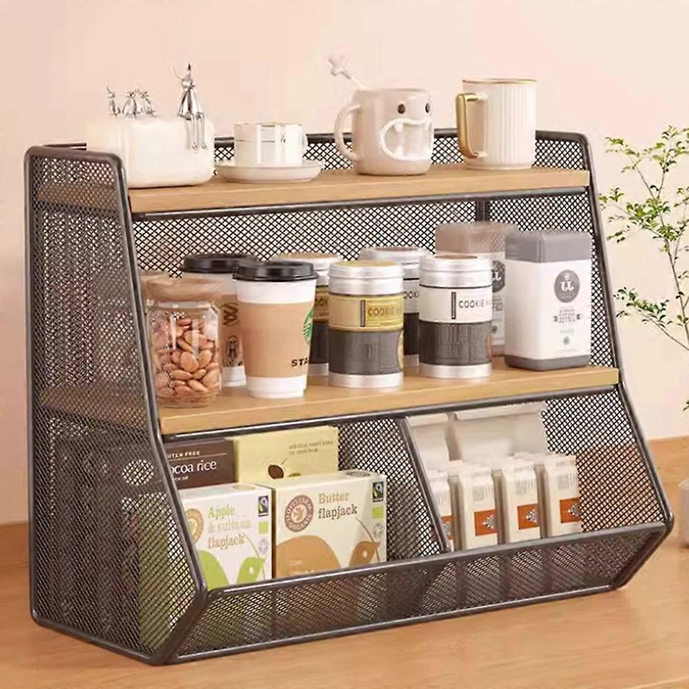 Desktop Storage Basket for Kitchen Countertop Iron Frame Wooden Board Dining Table Tea Cup Holder Shelf, Double Grid Black+Wood Color
