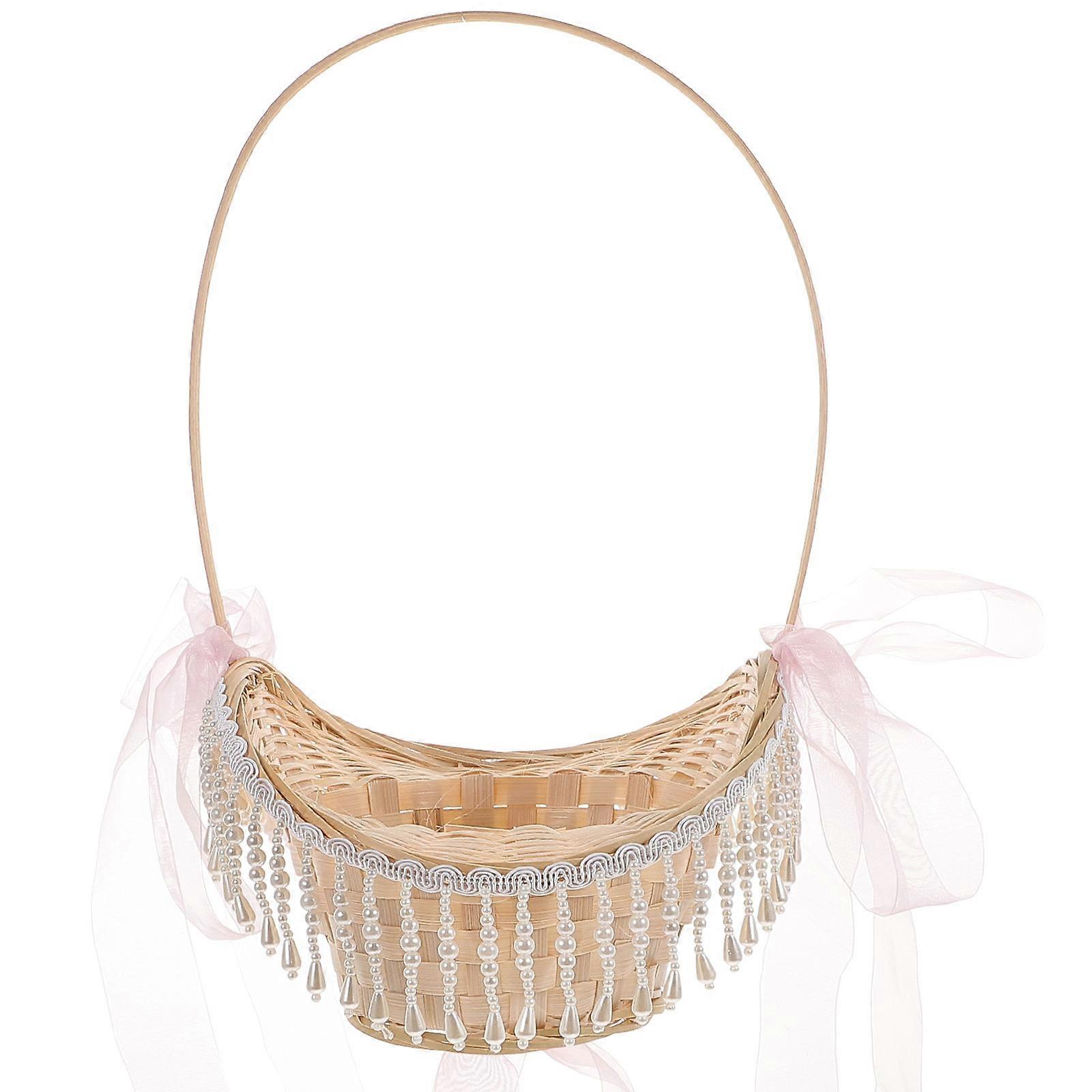 Pink Flower Girl Basket for Weddings Bamboo with Ribbon Handle Small Picnic Basket 7.5x4.5 Inches