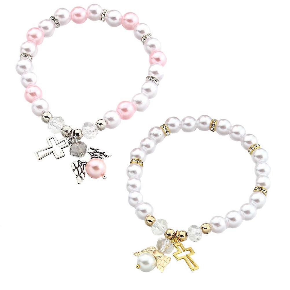 Delicate Cross Beaded Bracelet for Women Mixed White & Pink Artificial Pearls on Elastic Wristband Comfortable Religious Jewelry for Daily Wear &