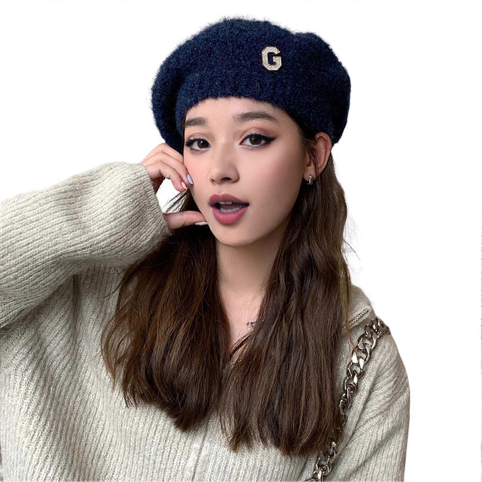 Lady Winter Beanie Rhinestone Letter Decor Japanese Style Elastic Beret Anti-slip Keep Warm Knitted Cap Solid Color Painter Hat