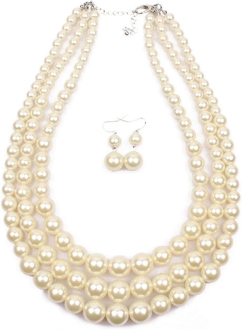 Shineland Elegant Simulated 3-laryered Multi-strand Pearl Cluster Collar Bib Choker Necklace Earring Sets