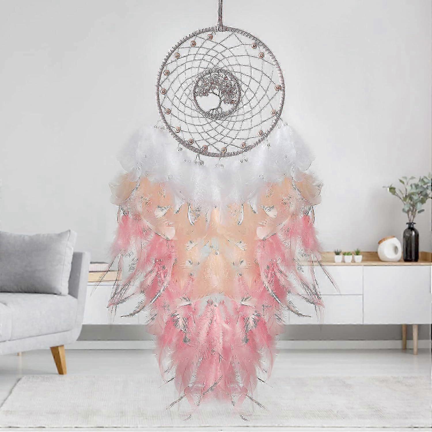 Tree of Life Dream Catcher Pink Feather Wall Decor Featuring Natural Healing Crystal Stone Perfect Handmade Home Decor and Bedroom Decor