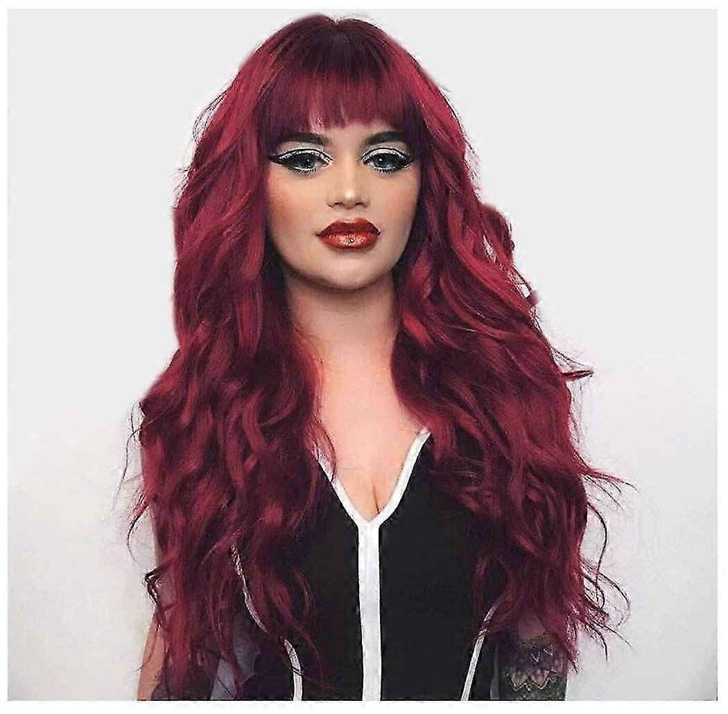 Long Burgundy Wig with Bang Women Long Wavy Fluffy Curly Heat Resistant Full Bang Girls Wi