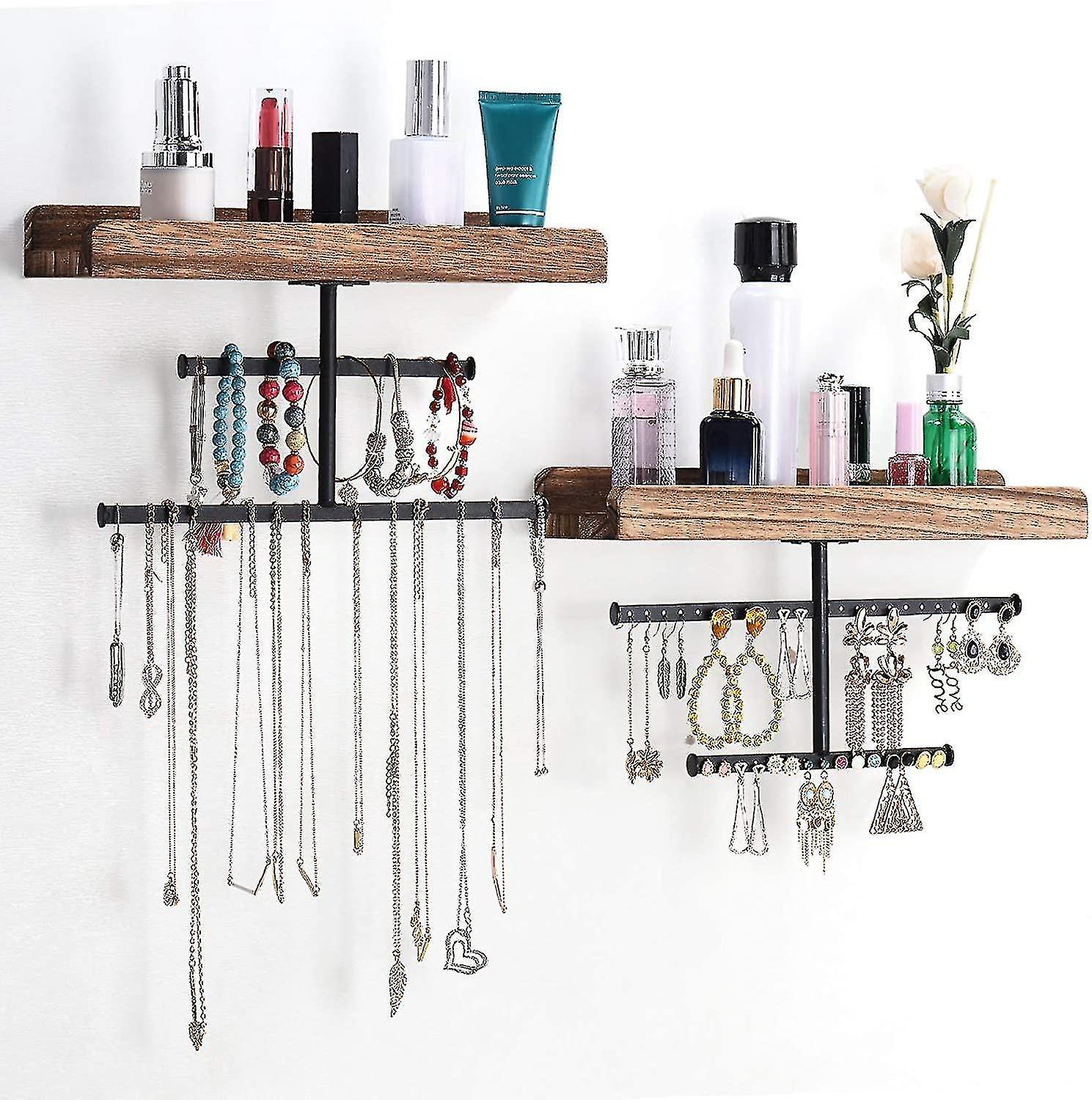2 Pack Jewelry Organizer for Necklaces Bracelet Earrings Ring for Home, Store2 SET HANGING JEWELRY ORGANIZER FOR WALLSet of 2 wall-mounted wood jewelry racks including 1 bracelet rack with37 hooks, and 1 necklace rack, Double functions that you can use onepart as storing your makeup or daily accessories, the other part forjewelry display. Better use of wall space while enjoying the largeststorage space.Decorative DisplayEasily installed onmost wall surfaces, can be arranged to suit nearly any space, whileproviding practical storage for a variety of favorite pieces.Easy to installNo any assemble, comes with required hardware and clearly instruction for quickly. any question will be replyed within 24 hours.SpecificationMaterialWood & MetalColor: Carbonized Black and BlackSize: 12.2*5.5*2.95 inchWhat's Included2x Wood Board 2x Metal Parts4x Screws 4x Wall PlugsMore detail show uRustic WoodStoring your makeup or daily accessoriesHanging for Necklaces & Bracele Suit for Various of Earrings