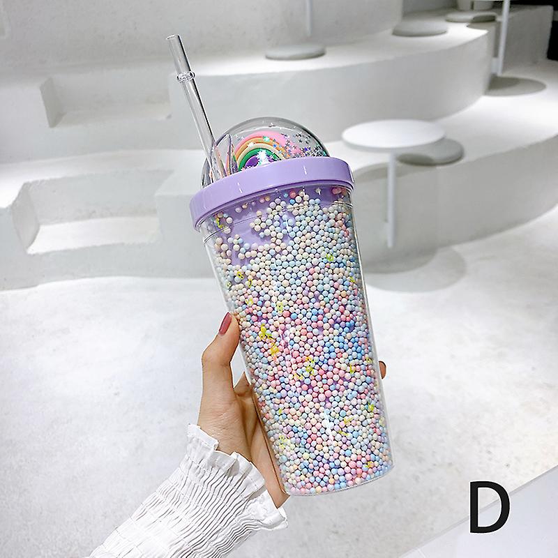 Double Layers Rainbow Plastic Water Bottle With Straw Creative 550ml Mug