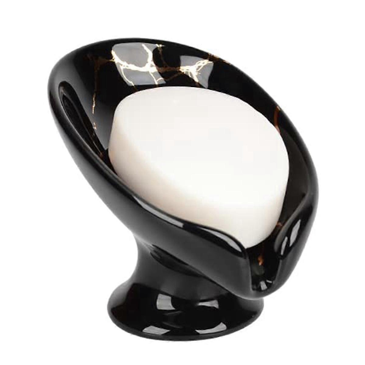 Soap Dish, Ceramic Soap Holder Self Draining Marble Look Leaf-Shape Soap Dishes for Bathroom,Black