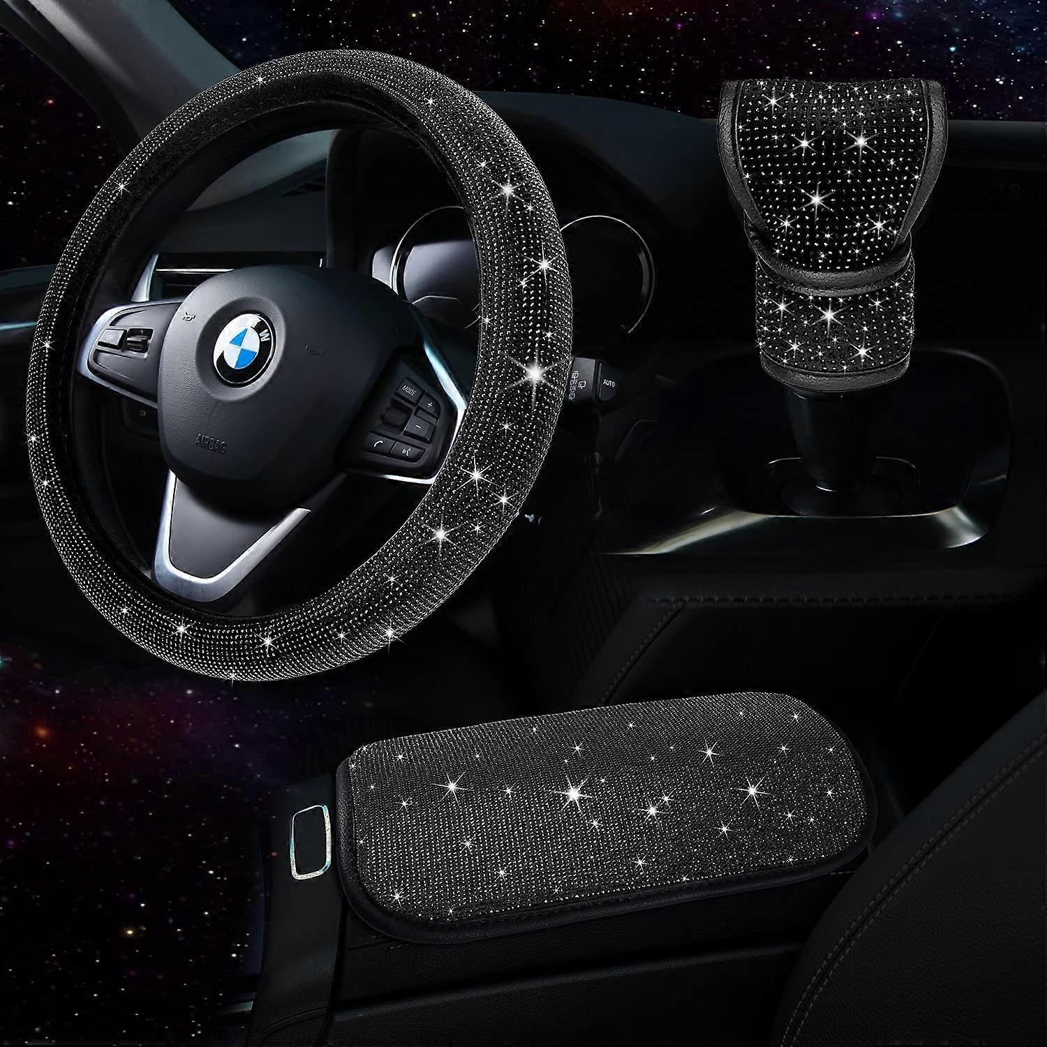 Red Bling Car Accessories Set for Women, Bling Steering Wheel Cover for Women Universal Fit 15 Inch, Rhinestone Center