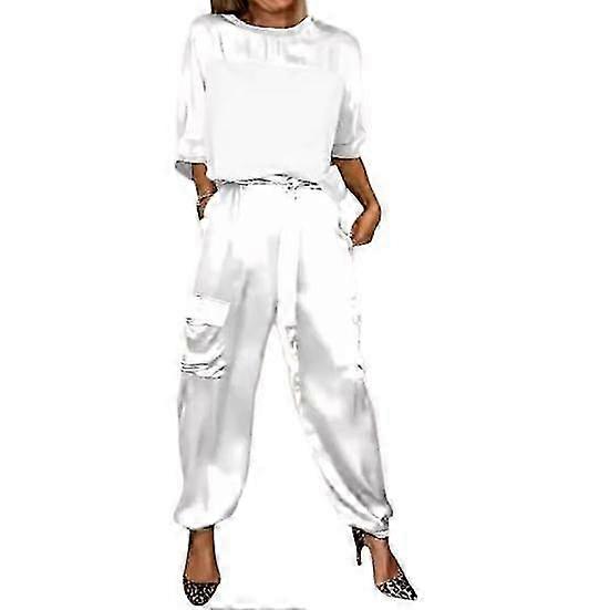 Satin Top and Pants Set for Women - Lace-Up Waist, 3/4 Sleeves, Pockets, Soft Casual Loungewear Outfit