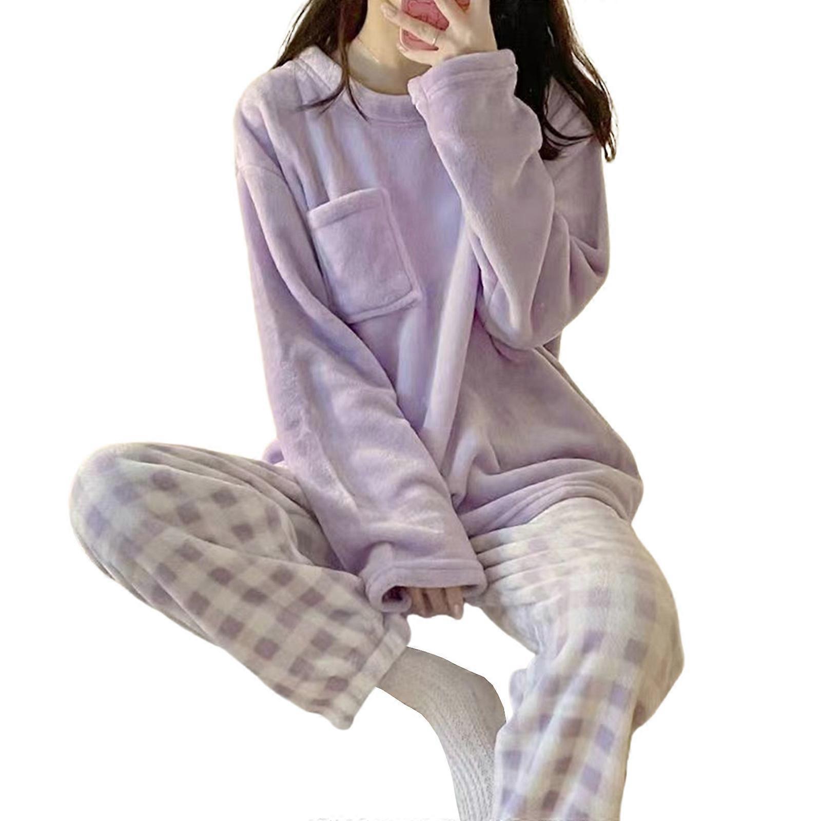 Women's Winter Pajamas Set Thick Fleece Sleepwear 2Pieces Long Sleeve Solid Top and Plaids Pants for Relaxed Home Wear Purple XL