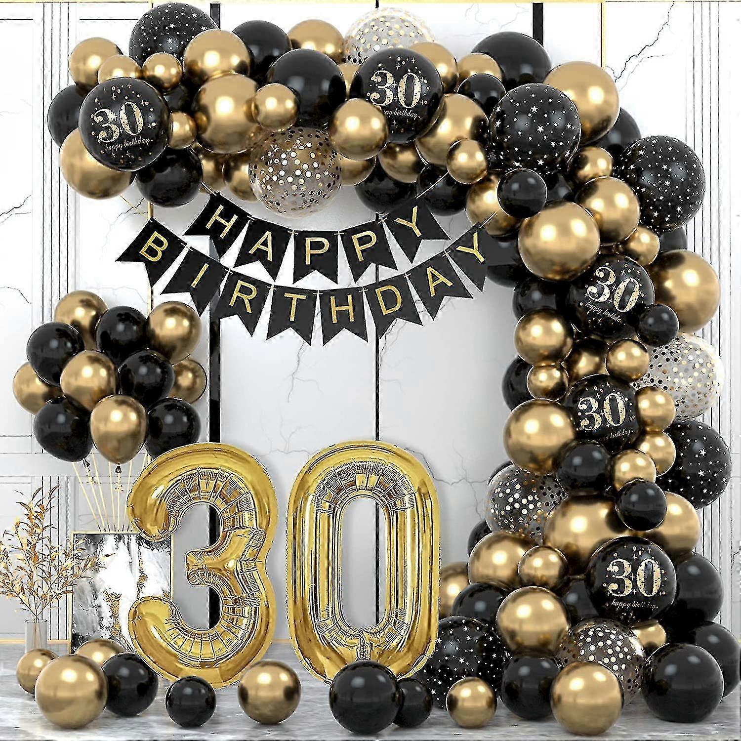 30th Birthday Decorations Kit: Black Gold Balloons, Garland Arch, Happy Banner for Party