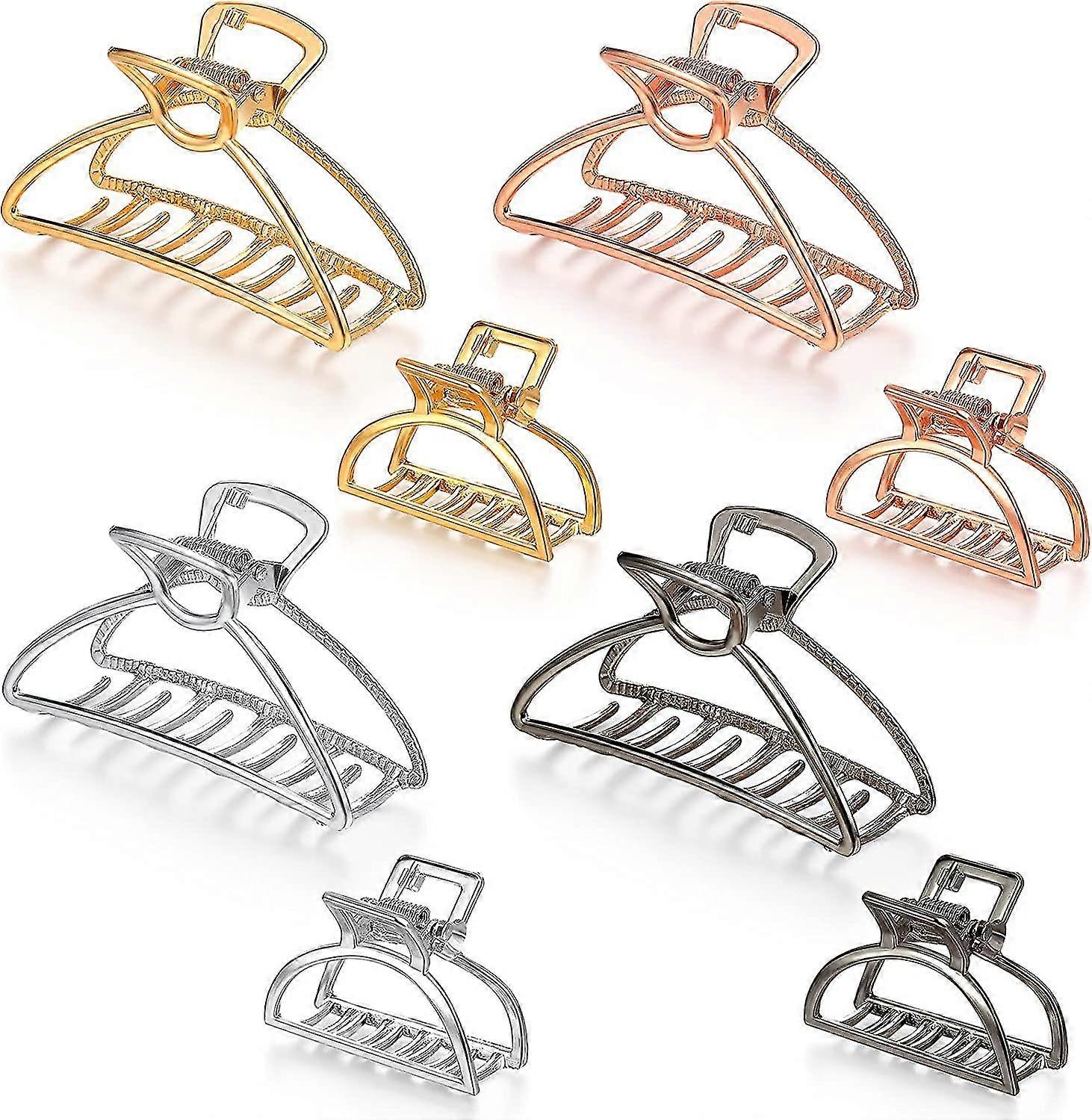 2 Sizes in one package: you will receive 8 pieces of metal hair claw clips, 4 pieces in 3-inch metal hair clips, and 4 pieces in 1.57-inch metal hair clips, these hair clips come in 4 elegant colors, which includes silver, gold, rose gold and black, which can satisfy you daily hair styling needs Exquisite workmanship: these metal hair clips are made of alloy, not easy to break, the surface is electroplated, the color is bright and shiny, the design is simple, the style is novel, and it adds luster to the hair, hard to fade, will serve you for a long time Specific size information: there are 2 sizes of metal hair clips, there are approx. 3 x 1.8 inches and 1.57 x 1.18 inches; The large hair clip is suitable for thick or long hair, and the small hair clip can hold the bangs or the head is different; The size has different uses, you can choose according to your needs Colorful color options: there are 4 simple yet classic colors to choose from, you can choose different color combinations according to the different clothing, the design is simple and atmospheric and can be applied, which can add a touch of color to your outfit Wide applications: this hair clip is suitable for most females, whether it is a lady or a girl, it can be applied for washing face, showering, shopping, makeup, and also as a daily hair accessory to match daily wear; At the same time, it is also a delicate and elegant gift
