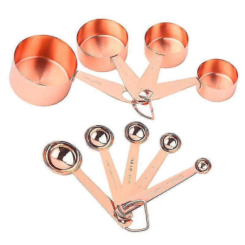 9-piece Set Of Kitchen And Baking Measuring Cups And Spoons, Stainless Steel Copper Chrome, With Engraved Measurements
