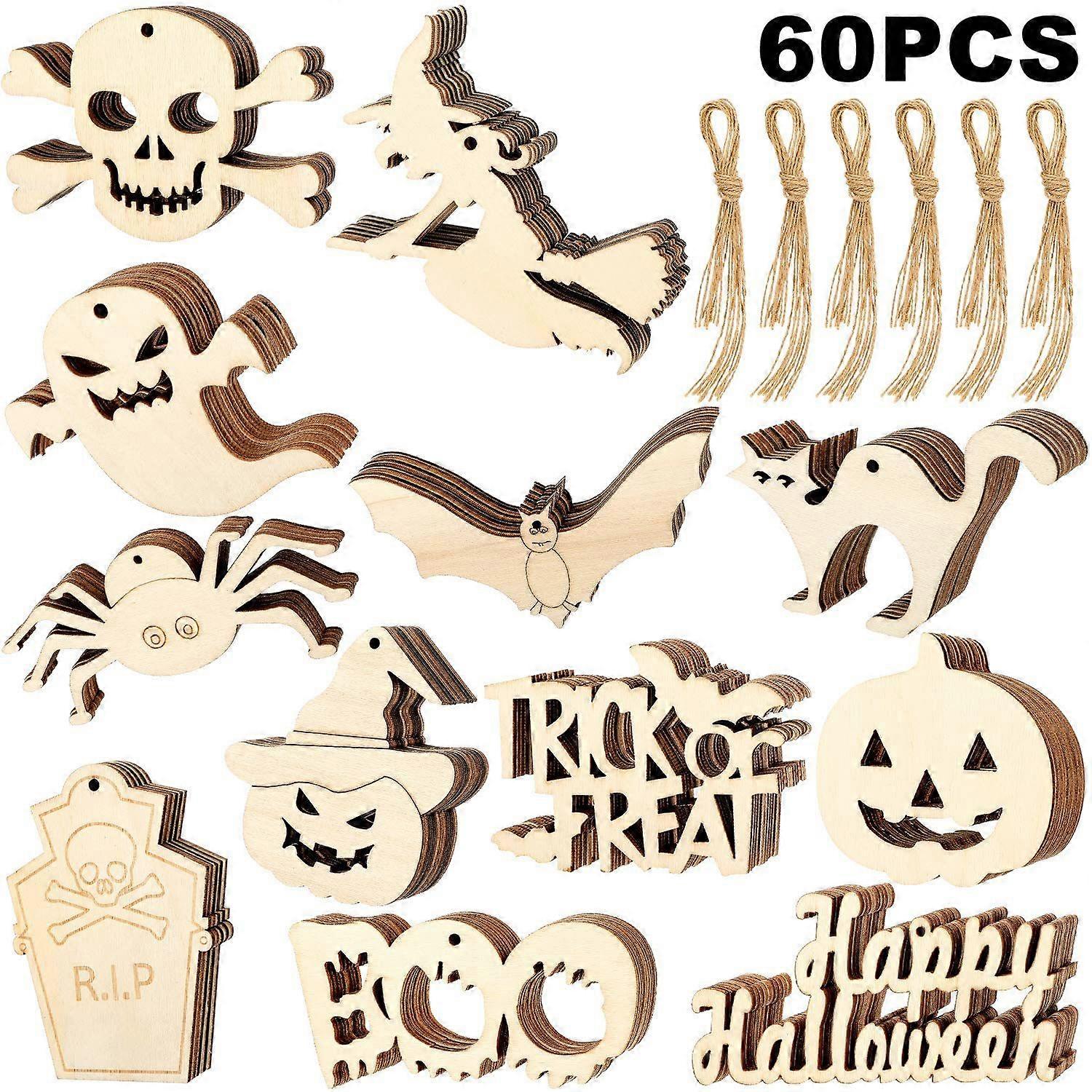 Pack of 60 Halloween Wood Chips Wooden Tags Halloween Wooden Ornament Crafts with Twine for Halloween Hanging Decorations, DIY Supplies, Halloween Par