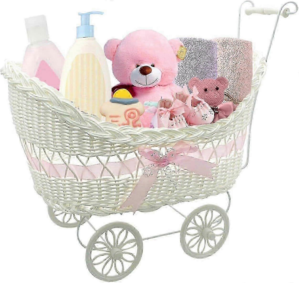 Baby Pram Hamper Wicker Toy Basket with Handles and Wheels Great Gift for Boy & Girl Baby Showers or Newborn Baby Gifts (Pink)