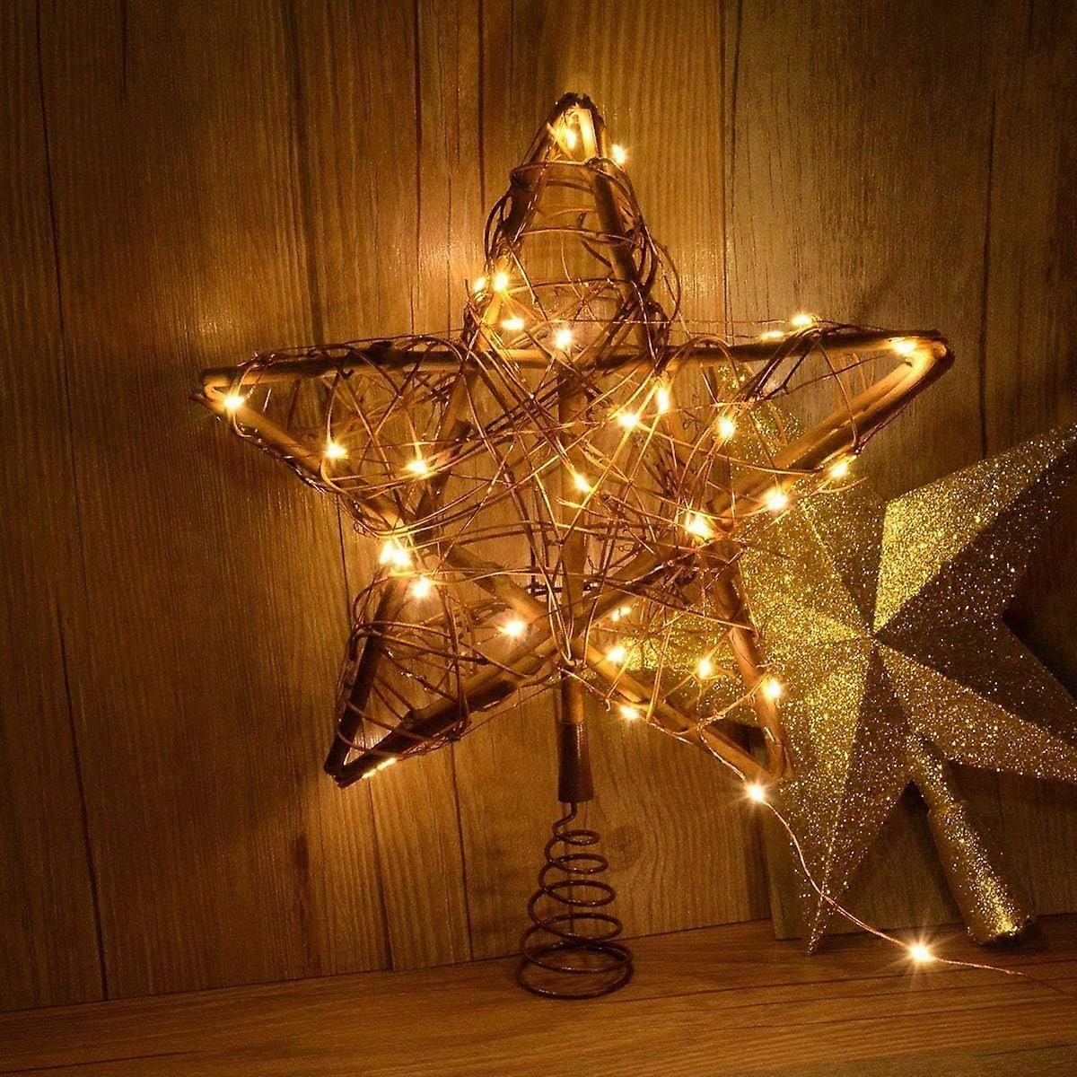 Christmas Star Tree Topper with 30 LED Warm White Copper Lights, Vintage Rattan Natural Christmas De
