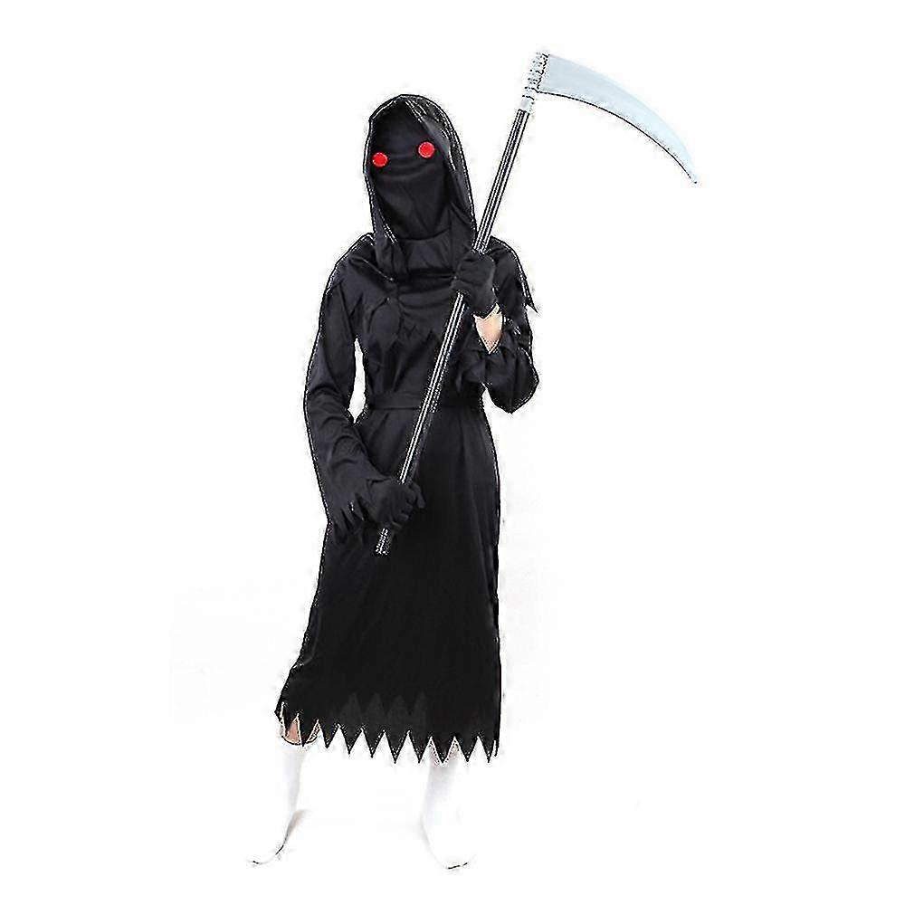 Halloween Grim-Reaper Cosplay Outfit With Red Eyes and Scythe Kids Horror Carnial Fancy Dress Costume Specifications Package Include:1 Set * Cosplay Costume Note: Due to different personal measurement methods, there will be an error of 2-4 cm, please understand Thanks for your support