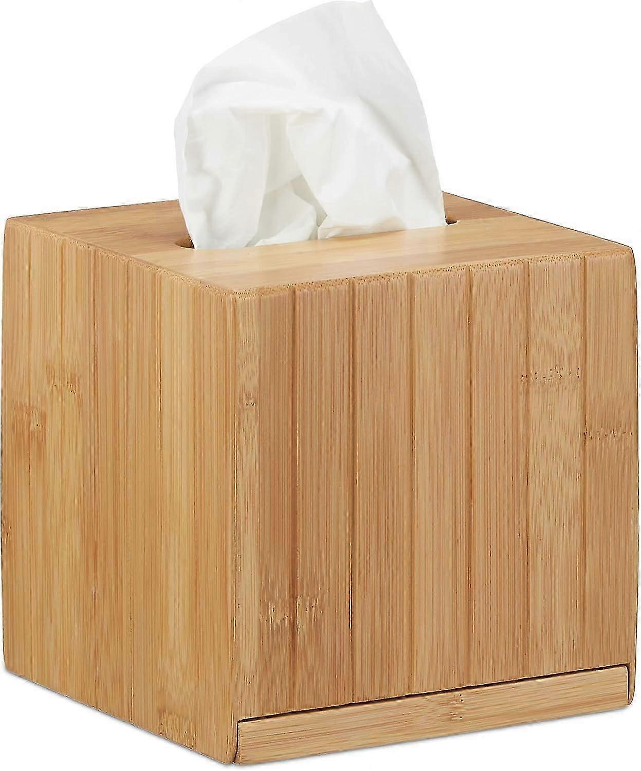 Decorative tissue box cover: Facial tissues and more always in reach - A trendy design to cover otherwise ugly boxes Versatile: Ideal as a dispenser for tissues, napkins and more - Ideal for bathroom, kitchen or living room Practical: Large opening for easy removal - Remove floor for a quick refill - Suitable for standard tissues Made of bamboo: Natural bamboo - The natural material is very durable and moisture resistant - Warm colour and grain Square: H x W x D: app. 14 x 14 x 14 cm - Inner dimensions H x W x D: app. 12.5 x 12.5 x 12.5 cm - Opening size W x L: app. 9.5 x 2 cm