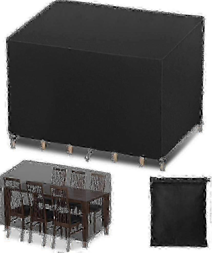 High quality tear resistant material: Upgrade the waterproof version. Made of high quality Oxford cloth with PVC coating, the cover is not only anti-UV but also coated inside, washable and wear-resistant. After repeated factory testing, the furniture cover can be filled with water for up to 48 hours without penetration. [Function] PVC coating has the advantages of waterproof, antifreeze, flame retardant , mildew resistant, cold resistant, corrosion resistant, anti-aging, anti-ultraviolet, easy to clean and high temperature resistant. It does not creak in snowy weather and protects your furniture well. Even in harsh environmental conditions, your patio furniture is safe, clean and dry. Windproof seat cover: There are 4 buckles on the patio furniture cover to ensure secure fastening. The lower part of the patio furniture cover can be fixed with movable buckles, and the lower end of the cover can be tightened by ropes, which can withstand strong winds. The tarpaulins protect your garden table and garden chairs from rain, snow, wind, dust, sun and more. Easy to clean: The furniture cover is black , resistant to dirt and wear. When cleaning, you can wipe with a damp cloth to quickly clean the cover. When you don't want to use it, you can put the furniture cover in a convenient storage bag without taking up space. Comes in a bag for easy storage. Sufficient Size: Warm Reminder: Please check the furniture size before placing an order to choose a more suitable size for your furniture cover. The cover is suitable for covering rectangular patio tables, rattan furniture or oval garden furniture.