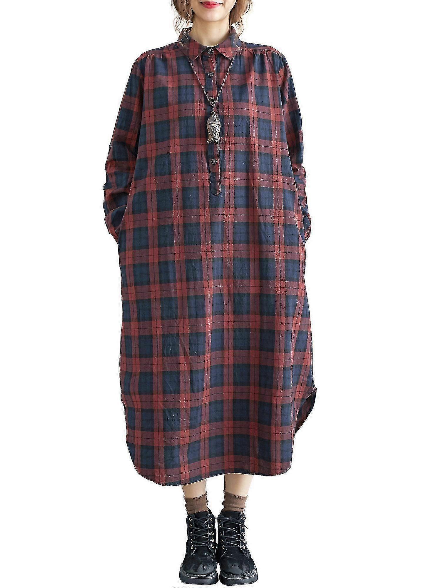 Women Plaid Dress With Pockets Buttons Long Sleeves Loose Dress p20241126912