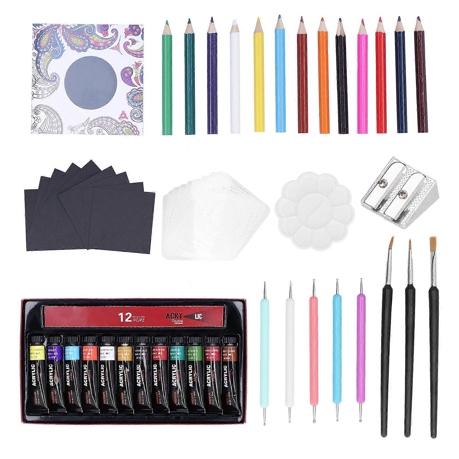 Features: 1.Wide range of uses, suitable for watercolor, gouache, acrylic and oil painting 2.The drill pen can be cleaned with a damp cloth or paper towel, which is very simple and convenient 3.The set contains color lead, acrylic paint, pencil sharpener, hook line pen, palette, mandala coloring book, drawing book and other tools 4.The product tool is complete, suitable for people at all stages, and it is also the best gift for gifting 5.Using ultra?lightweight plastic, you will not feel fatigue from heavy toolsno strong acrylic and stainless steel tools specification:Item Type: Acrylic Paint Painting Set Product s: 55 pcs/set Product Material: Paper + Plastic + Acrylic + Basswood The Product Contains: 9 Mandala Drawing Templates, 13 Coloring Pens, 3 Hook Line Brushes, 5 Double-Sided Drill Pens, 10 Rectangular Cardboards, 1 Pencil Sharpener, 1 Plum Color Palette , 1 Mandala Coloring Book, 12-Color Acrylic Paint Product Use: Painting, Coloring and Graffiti Applicable People: Most People PackageList: 9 x Mandala Painting Template 10 x Rectangular Cardboard 3 x Hook Line Brush 5 x Double-sided Drill Pen 1 x Pencil Sharpener 1 x Plum Color Palette 1 x Mandala Coloring Book 12 x Acrylic Paint 13 x Coloring Pen