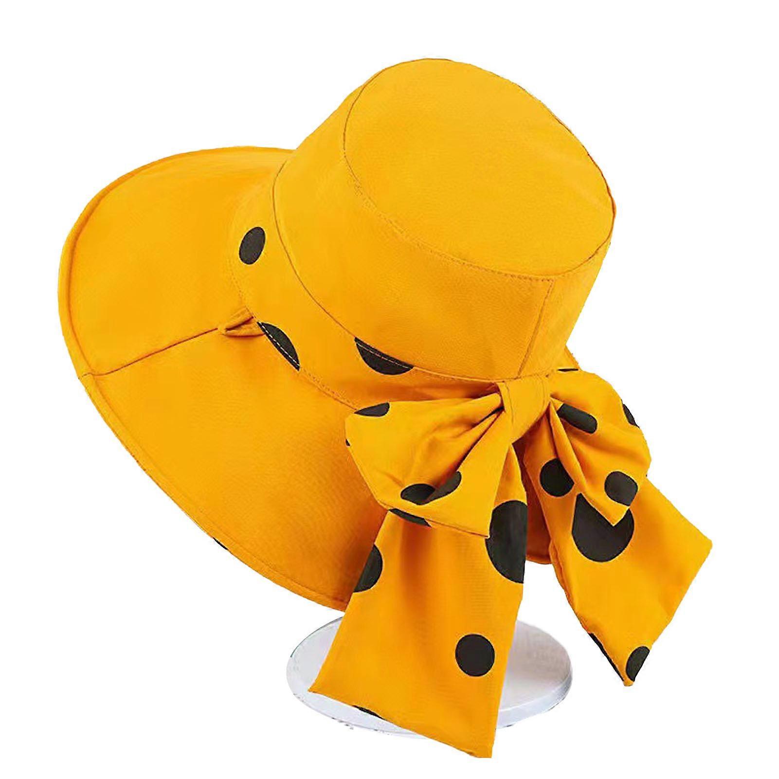 Wide Brim Sun Hat with Bow Tie Comfortable Breathable Double Side Wear Reversible Sun Bucket Hat for Summer Outdoor Yellow