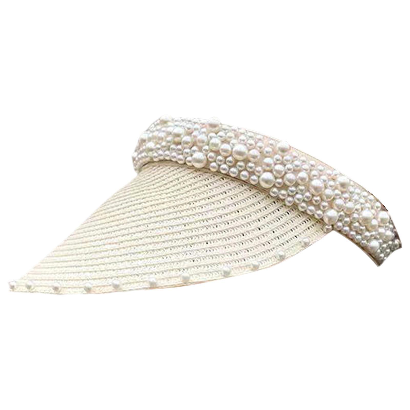 Women Hat Solid Color Big Brim Breathable Adjustable Imitation Pearl Summer Cap Headwear