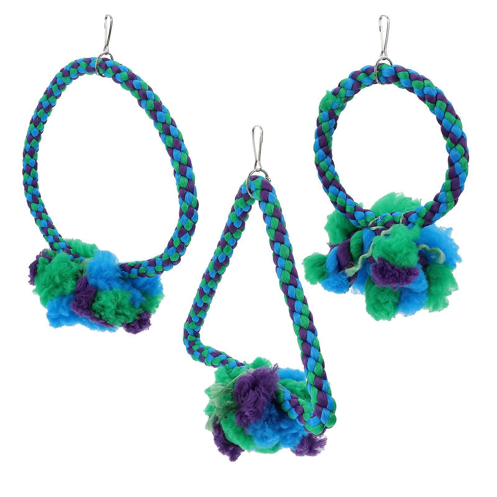 This bird swing toy is made of cotton rope that is durable, safe for your pet bird. They are great for pet bird, parrot to chew, play, stand, rest. They are made of fine workmanship, simple design while practical to use. Provide an optical environment for your pet to enjoy themselves and that will also make you happy. Features - ColorAssorted Color - Material: Cotton. - Size: 22.00X28.00X10.00cm/8.65X11.00X3.93inch. - Made of cotton material, designed with and creative shape, safe and durable for your pet bird. - Swing pet bird toys your pet birds enjoy playing all the time. - It can not only be provided for birds to play, but also can exercise your pet bird. - Bright colors attract your pet's attention, cotton rope material, bite and wear resistance. - Can be treated as a wonderful present for your friends who have pet bird. Package list: 3 swing toys